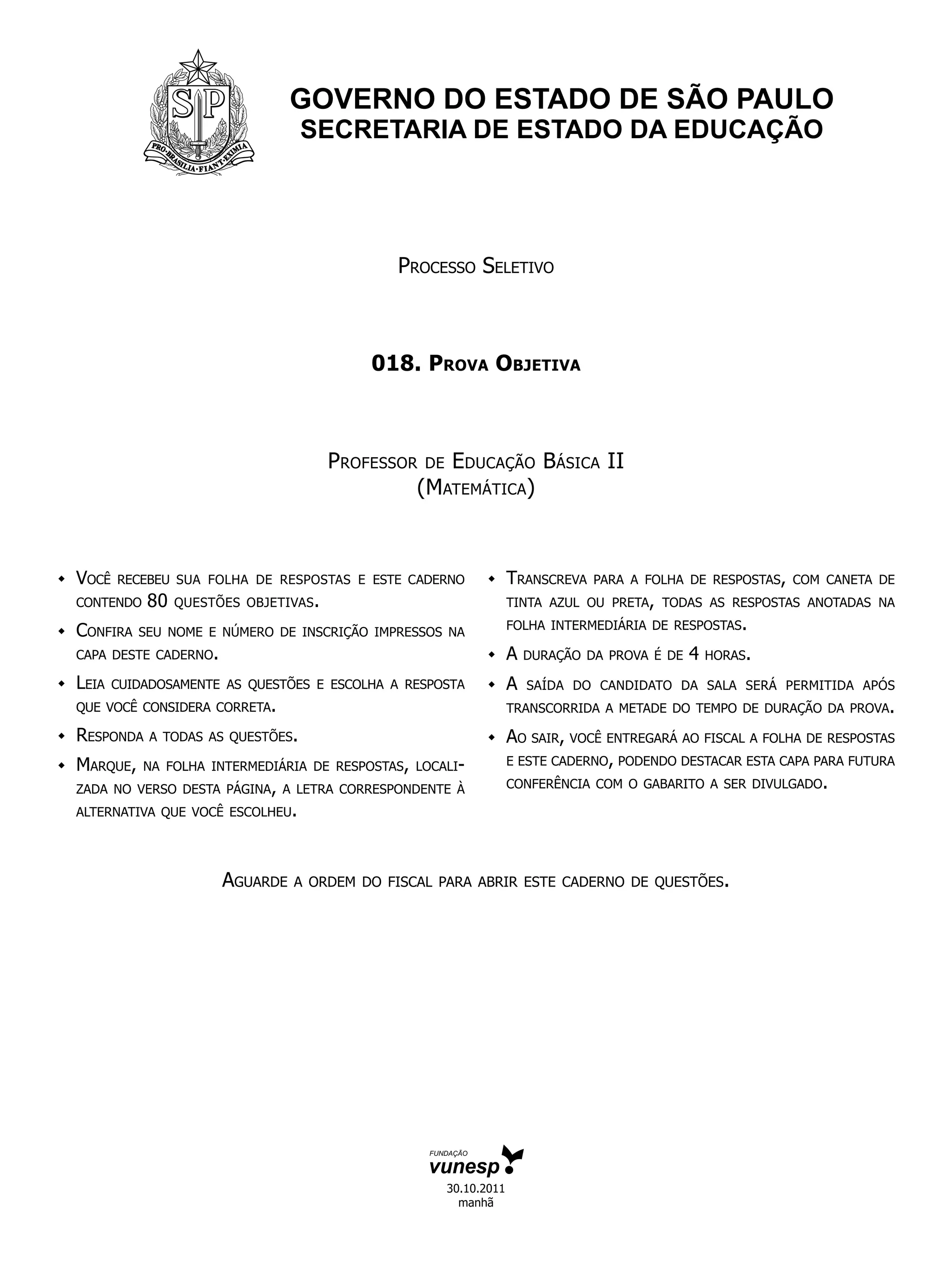 1) O documento descreve as instruções e procedimentos para a realização de uma prova objetiva para seleção de professores de educação básica;