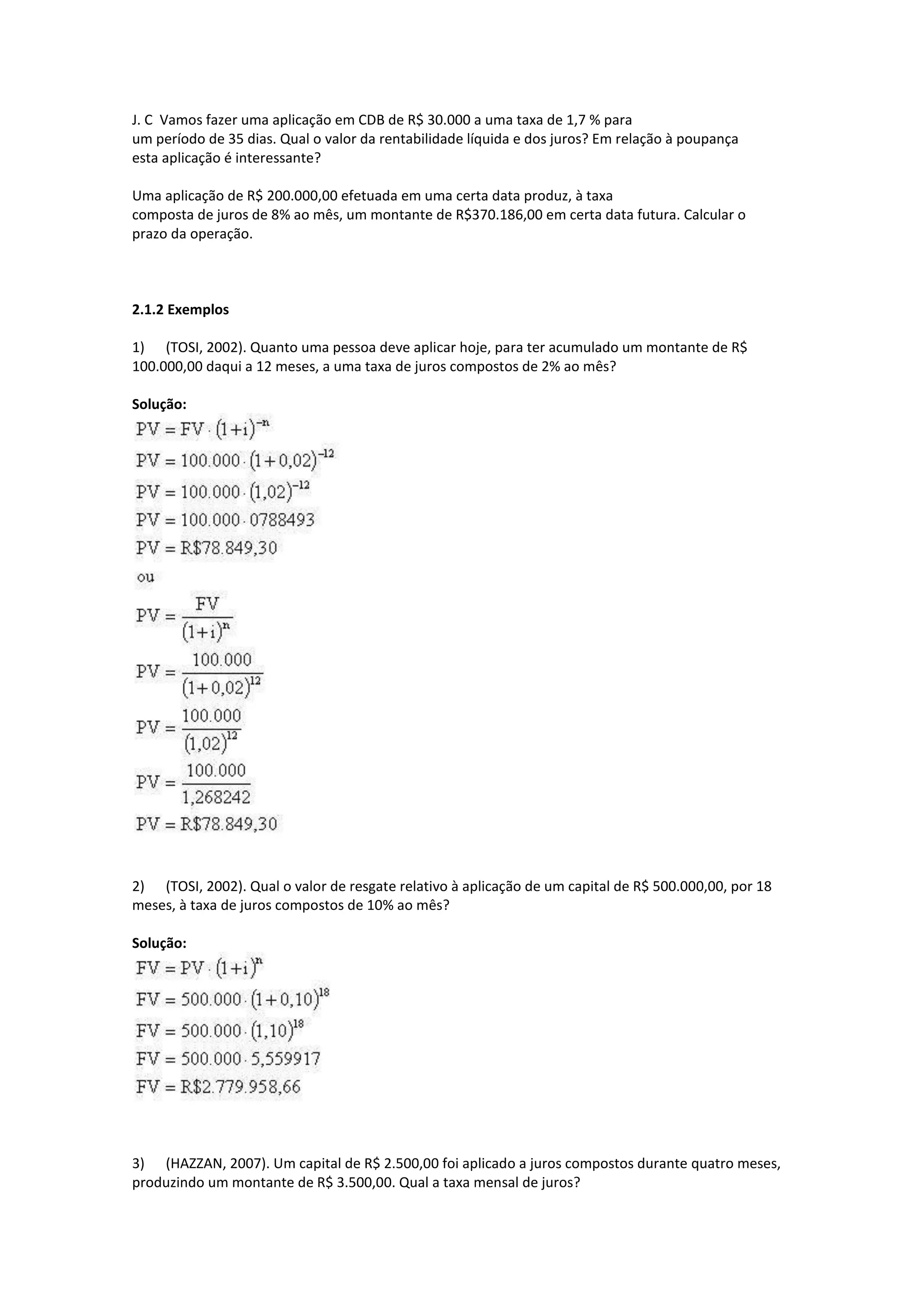 1) O documento apresenta exemplos de cálculos de juros compostos, taxas efetivas e nominais, e conversão entre taxas.