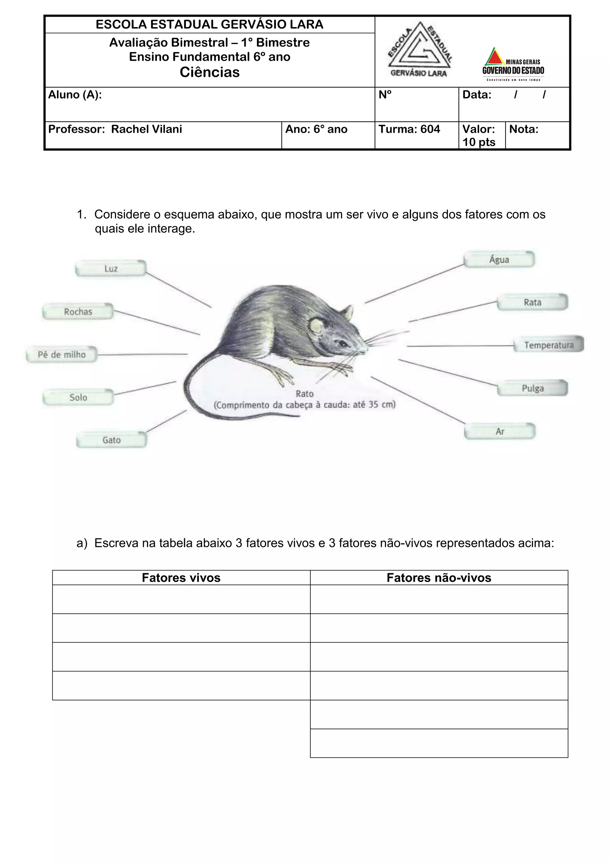 Este documento apresenta uma avaliação bimestral de Ciências do 6o ano com 5 questões. A primeira pede para identificar 3 fatores vivos e não-vivos em um diagrama de interação de um ser vivo. A segunda relaciona conceitos ecológicos com figuras. A terceira associa biomas brasileiros com suas descrições. A quarta identifica o bioma referido em um poema. A quinta relaciona números em um mapa com os biomas correspondentes."