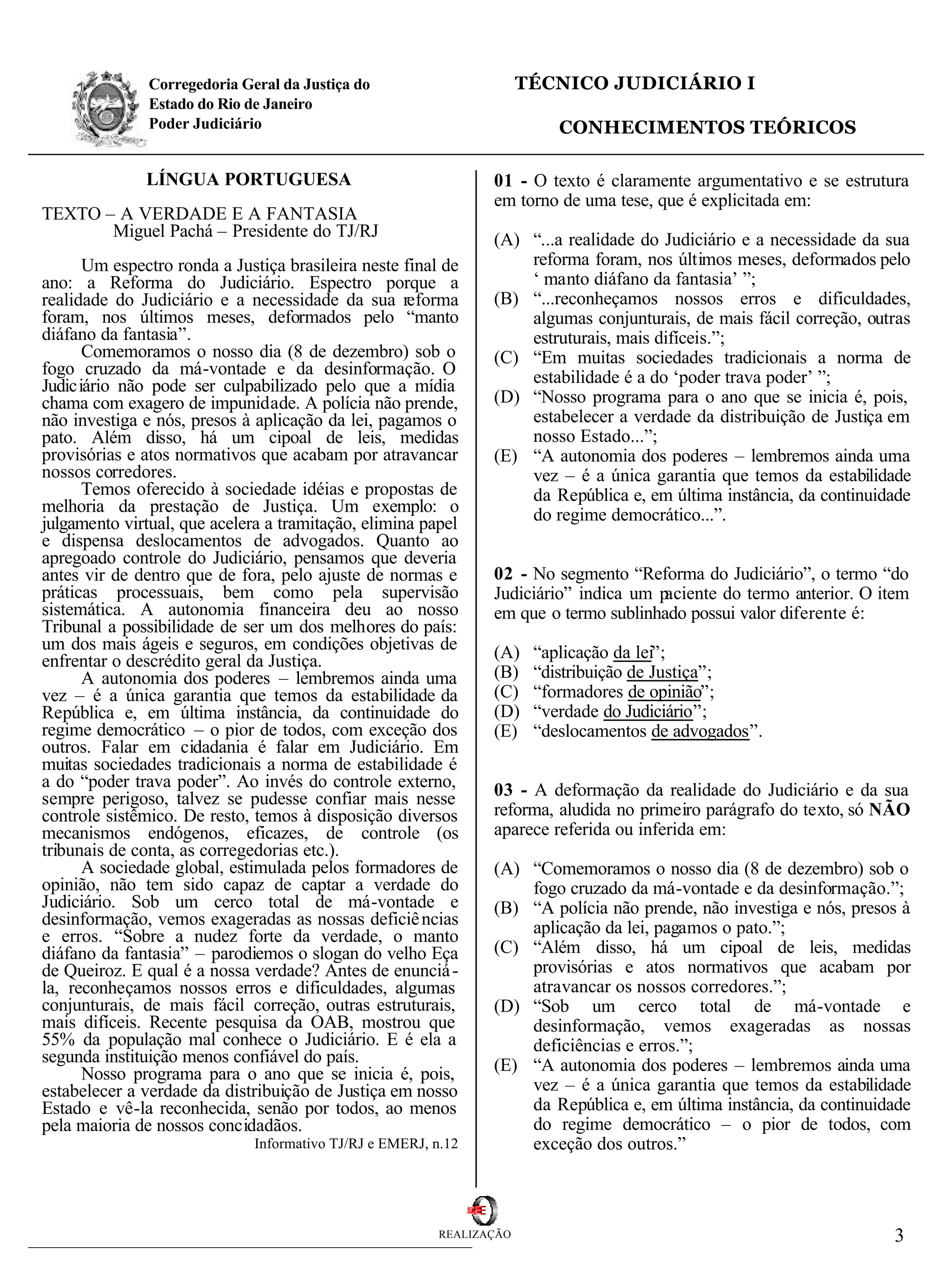 O texto discute a necessidade de reforma do Judiciário brasileiro e as distorções causadas pela fantasia e desinformação. O autor defende a autonomia do poder judiciário e propõe estabelecer a verdade sobre a distribuição de justiça no estado para reconquistar a confiança pública.
