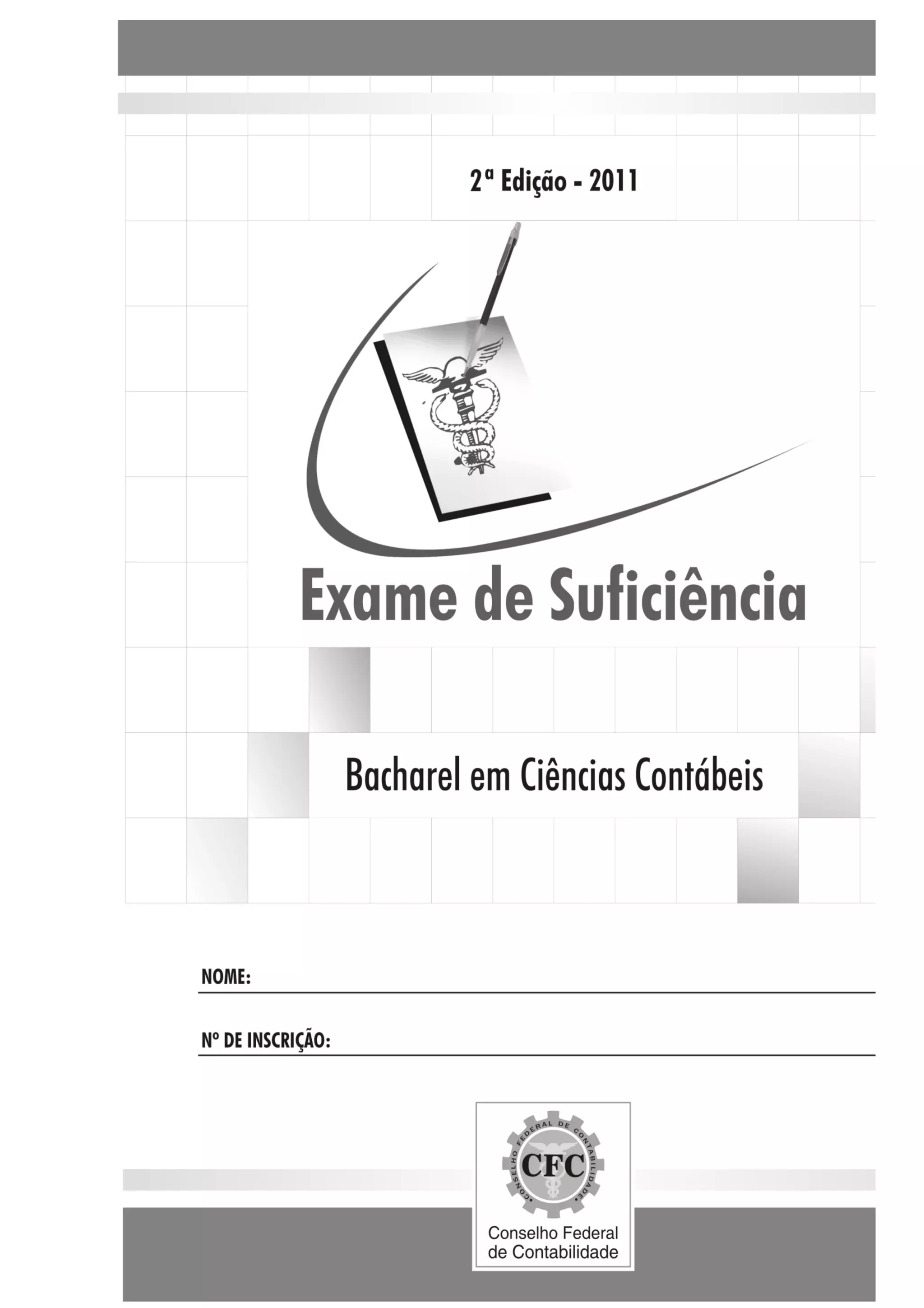 O documento apresenta instruções para a realização de uma prova de suficiência para bacharel em ciências contábeis do Conselho Federal de Contabilidade. Nele constam informações como: abertura da prova, preenchimento da folha de respostas, duração da prova e questões sobre diversos temas contábeis.