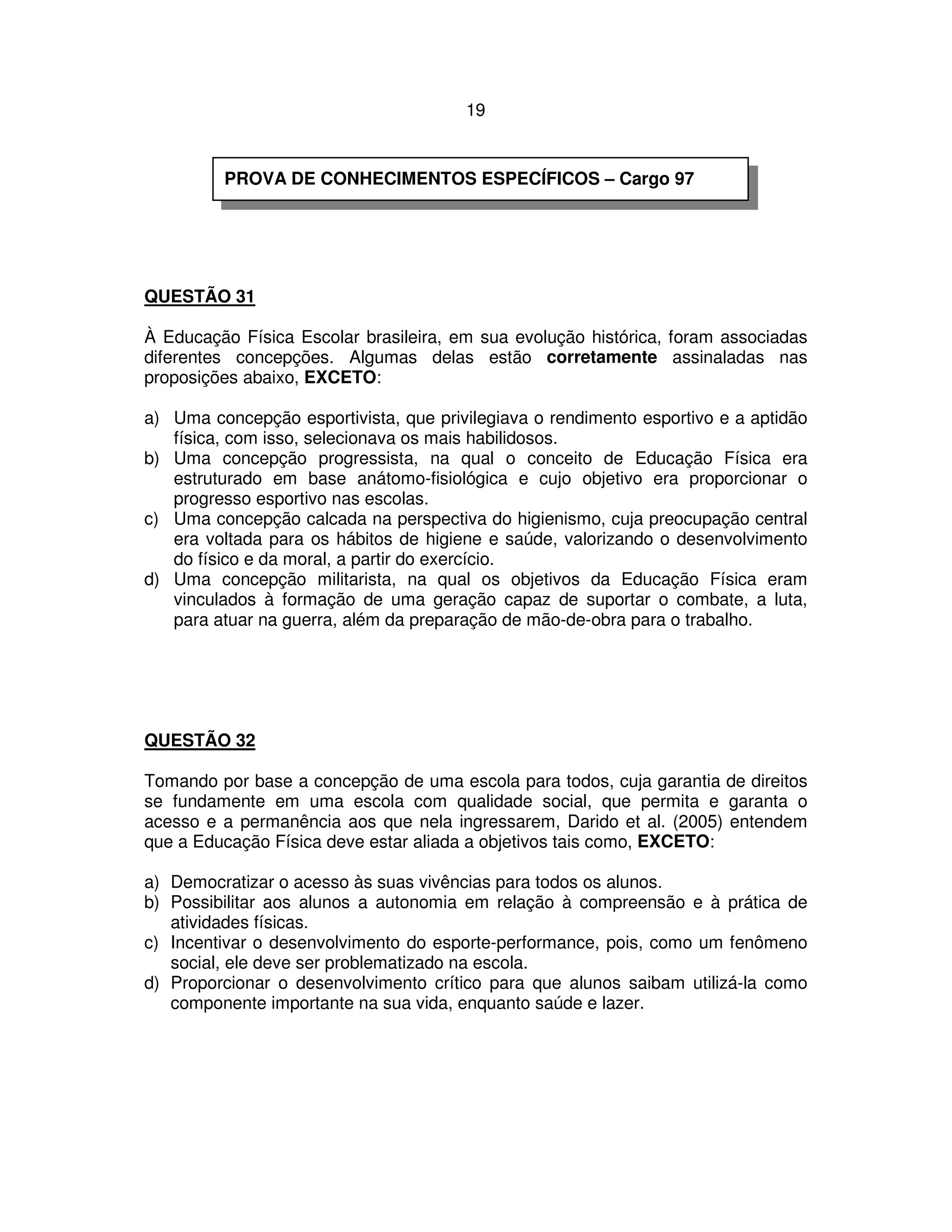 O documento discute diferentes concepções da Educação Física Escolar brasileira ao longo da história. Uma delas privilegiava o rendimento esportivo e a seleção dos mais habilidosos, enquanto outra se concentrava nos hábitos de higiene, saúde e desenvolvimento físico e moral por meio do exercício. A concepção militarista visava preparar os alunos para a guerra e o trabalho braçal.