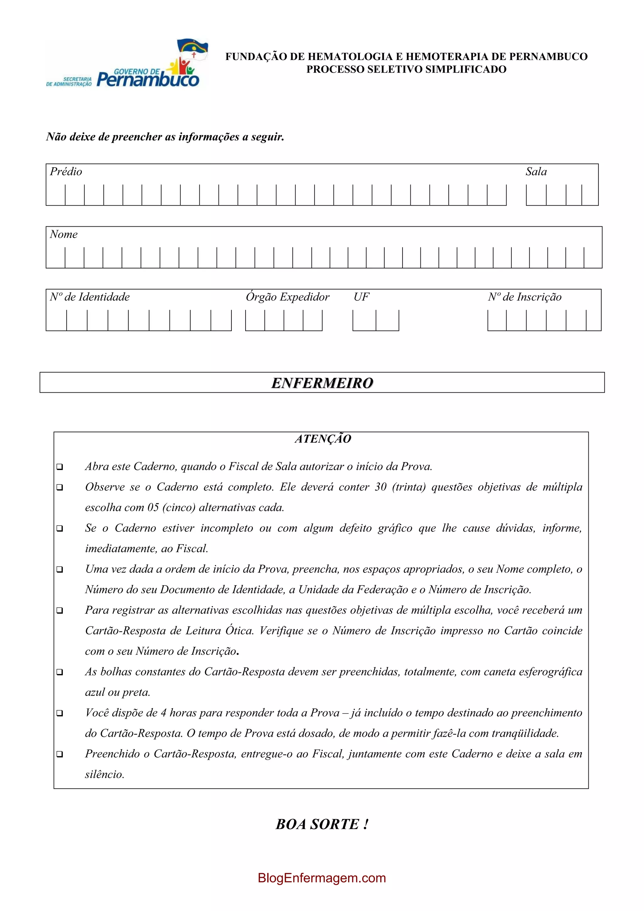 Este documento fornece instruções para a realização de um processo seletivo simplificado. Ele instrui os candidatos a preencher seus dados pessoais, verificar a correspondência do número de inscrição no caderno e cartão-resposta, e realizar a prova em até 4 horas.