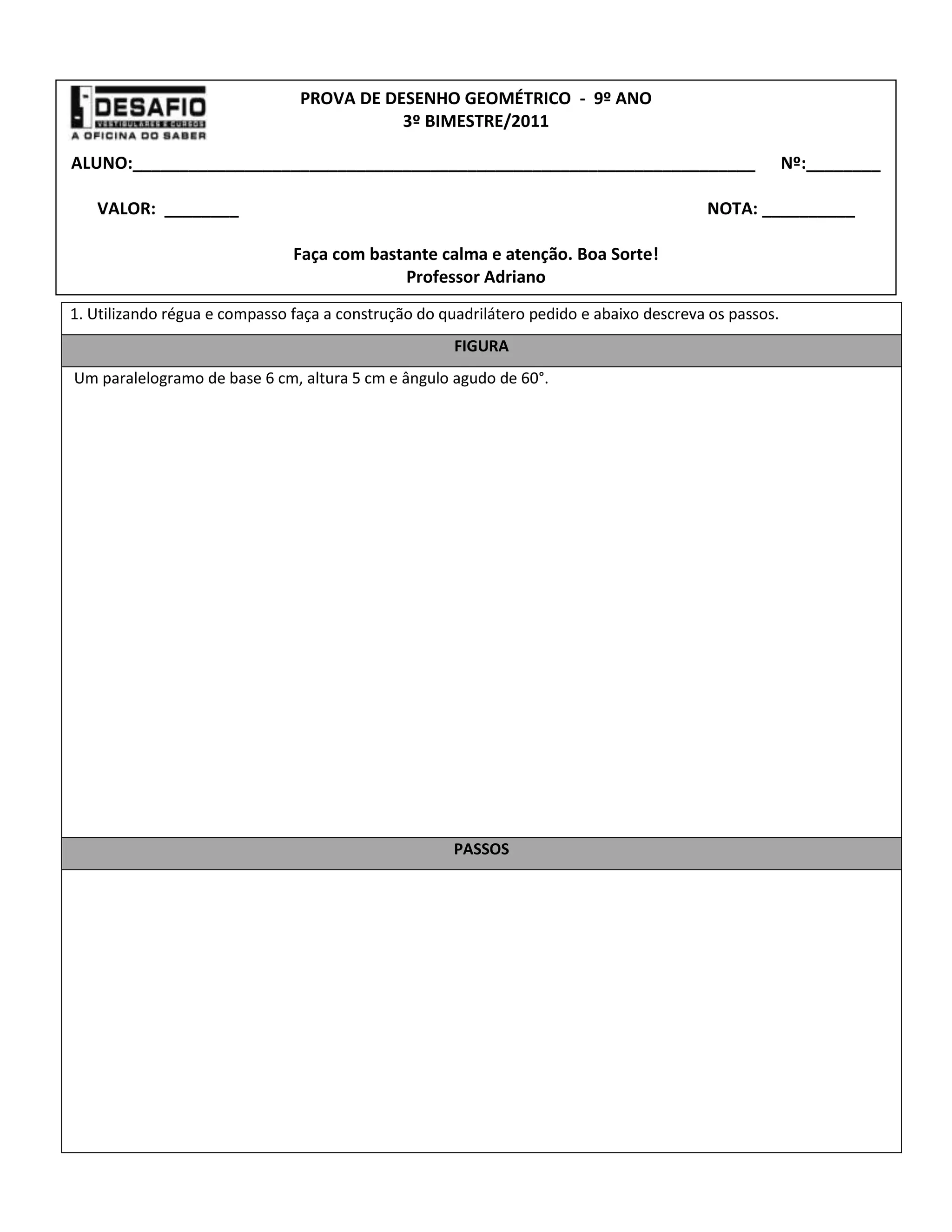 O documento contém um teste de geometria com 6 questões sobre propriedades de quadriláteros. A primeira questão pede para construir e descrever os passos para construir um paralelogramo. A segunda pede para desenhar um trapézio isósceles e indicar seus ângulos. A terceira pede para determinar os ângulos agudos de um rombóide. A quarta contém afirmações sobre quadriláteros para verificar. A quinta pede para determinar o maior ângulo de um trapézio dado a soma e diferença de