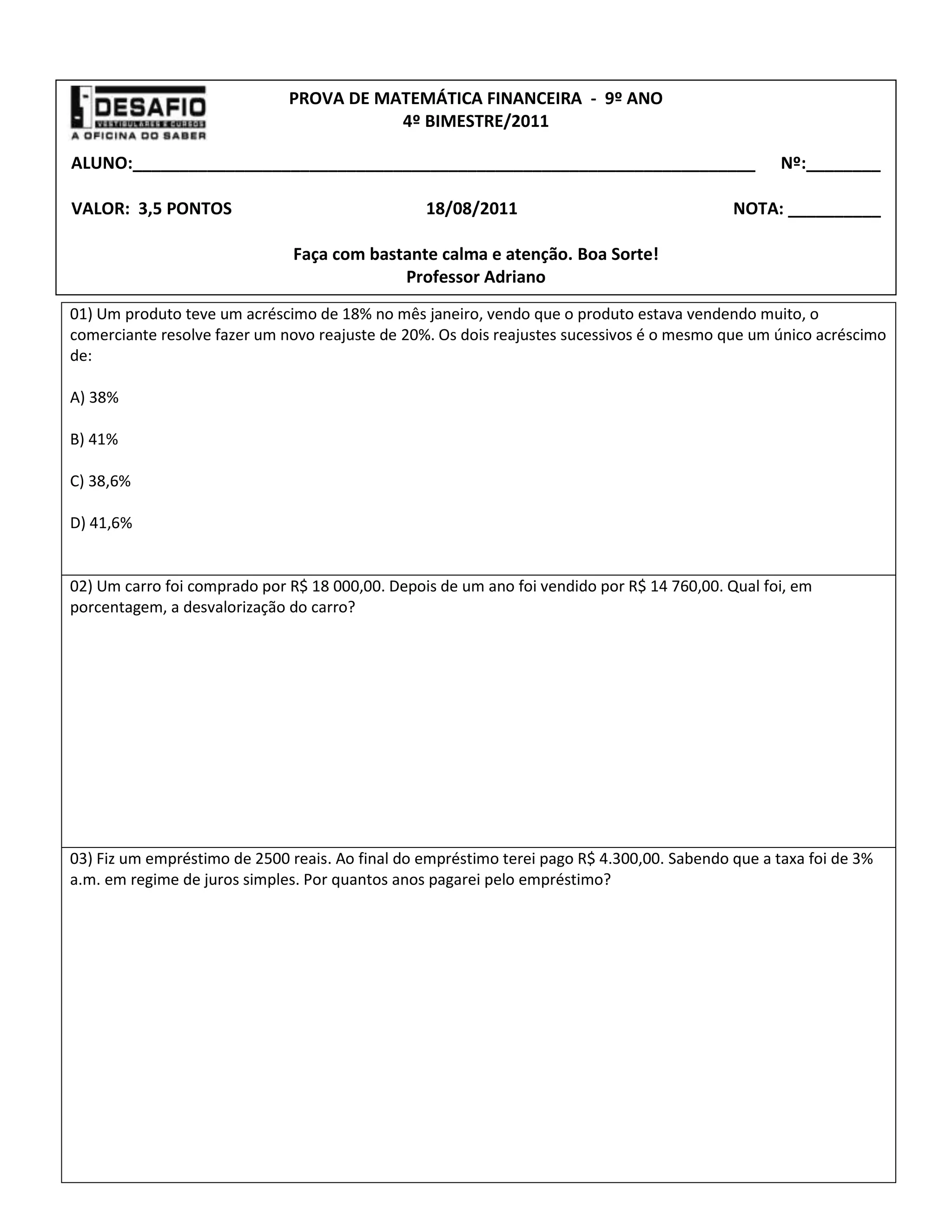 Este documento é uma prova de matemática financeira do 9o ano com 5 questões. A primeira pergunta trata de dois reajustes sucessivos de preços de um produto e pede para calcular o reajuste equivalente único. A segunda questão pede para calcular a desvalorização de um carro após um ano. A terceira pergunta trata de um empréstimo e pede para calcular em quantos anos ele será pago. A quarta questão pede para calcular o capital inicial necessário para obter um determinado montante após um período com juros simples