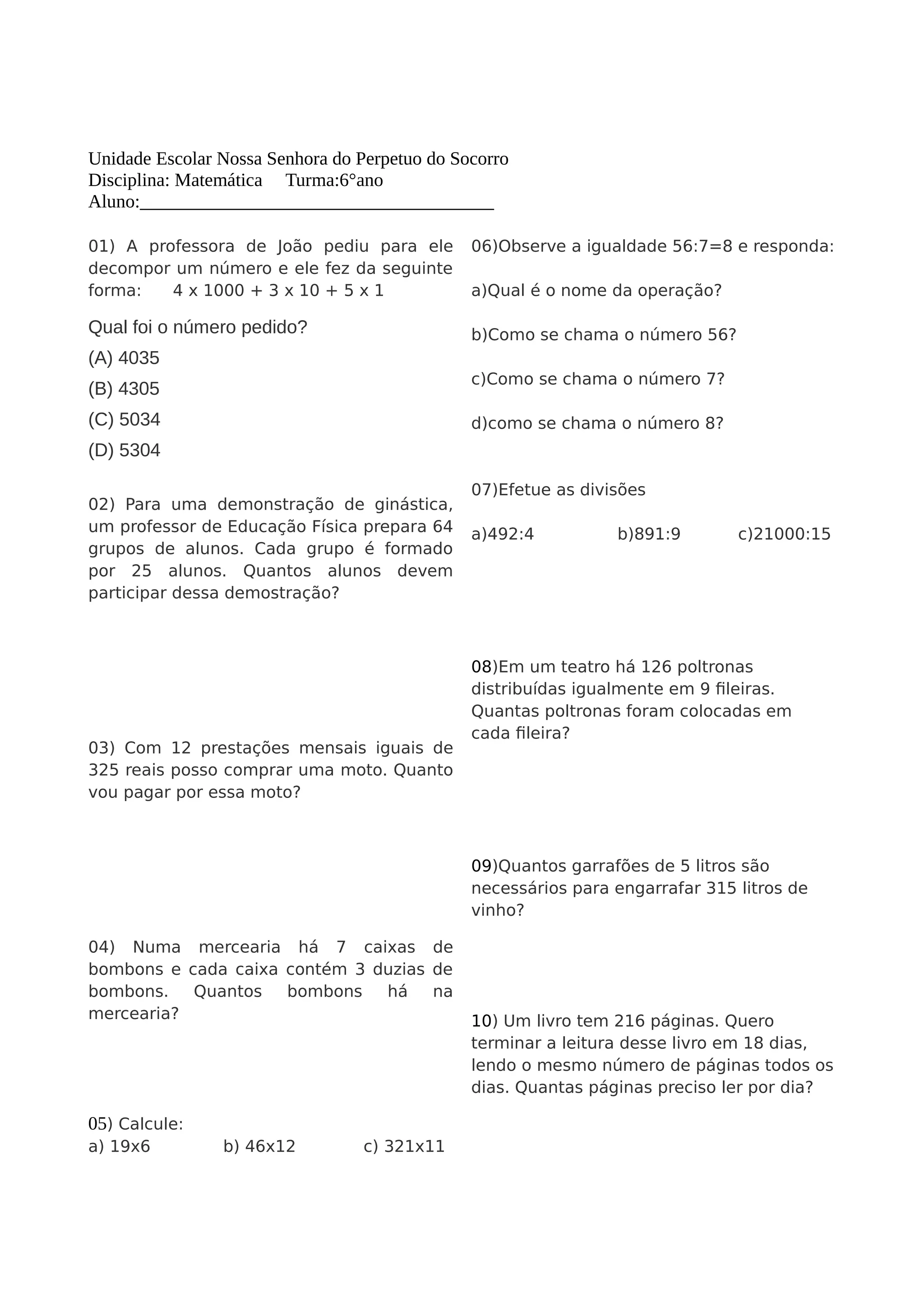 Este documento contém 10 questões de matemática para alunos do 6o ano. As questões envolvem decompor números, calcular quantidades totais, realizar operações como multiplicação, divisão e proporcionalidade, e calcular médias.