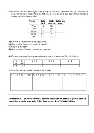 2) Os alunos devem responder perguntas sobre conjunto de números inteiros, operações com números negativos e positivos, cálculo de temperatura, extrato bancário e estatísticas de gols de times em um campeonato.