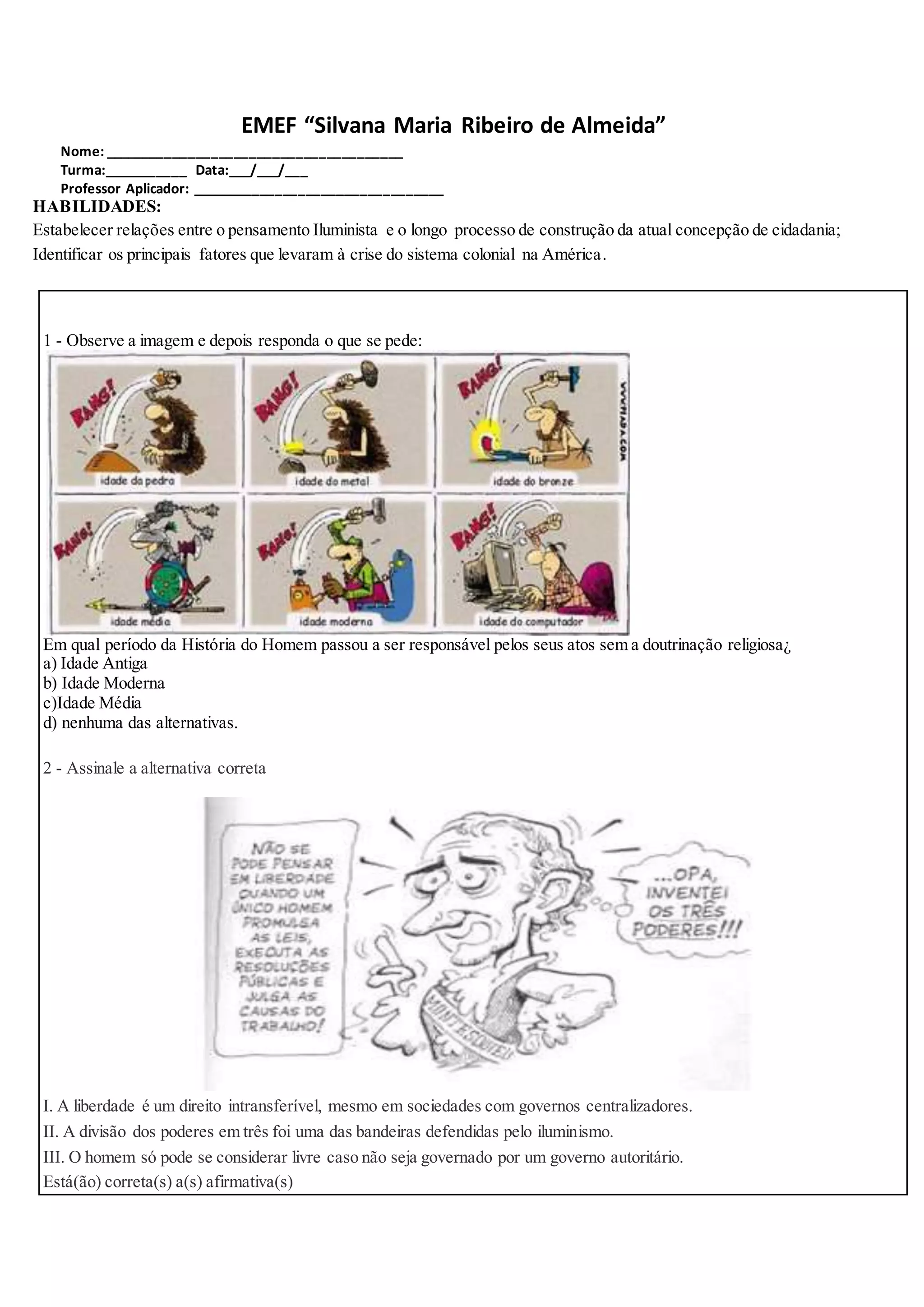O documento contém 10 questões sobre o Iluminismo e a independência dos Estados Unidos. As questões abordam tópicos como os princípios iluministas de liberdade, divisão de poderes e direitos naturais; os filósofos que influenciaram o movimento; e os fatores que levaram à independência dos EUA, como a ajuda militar e financeira da França.