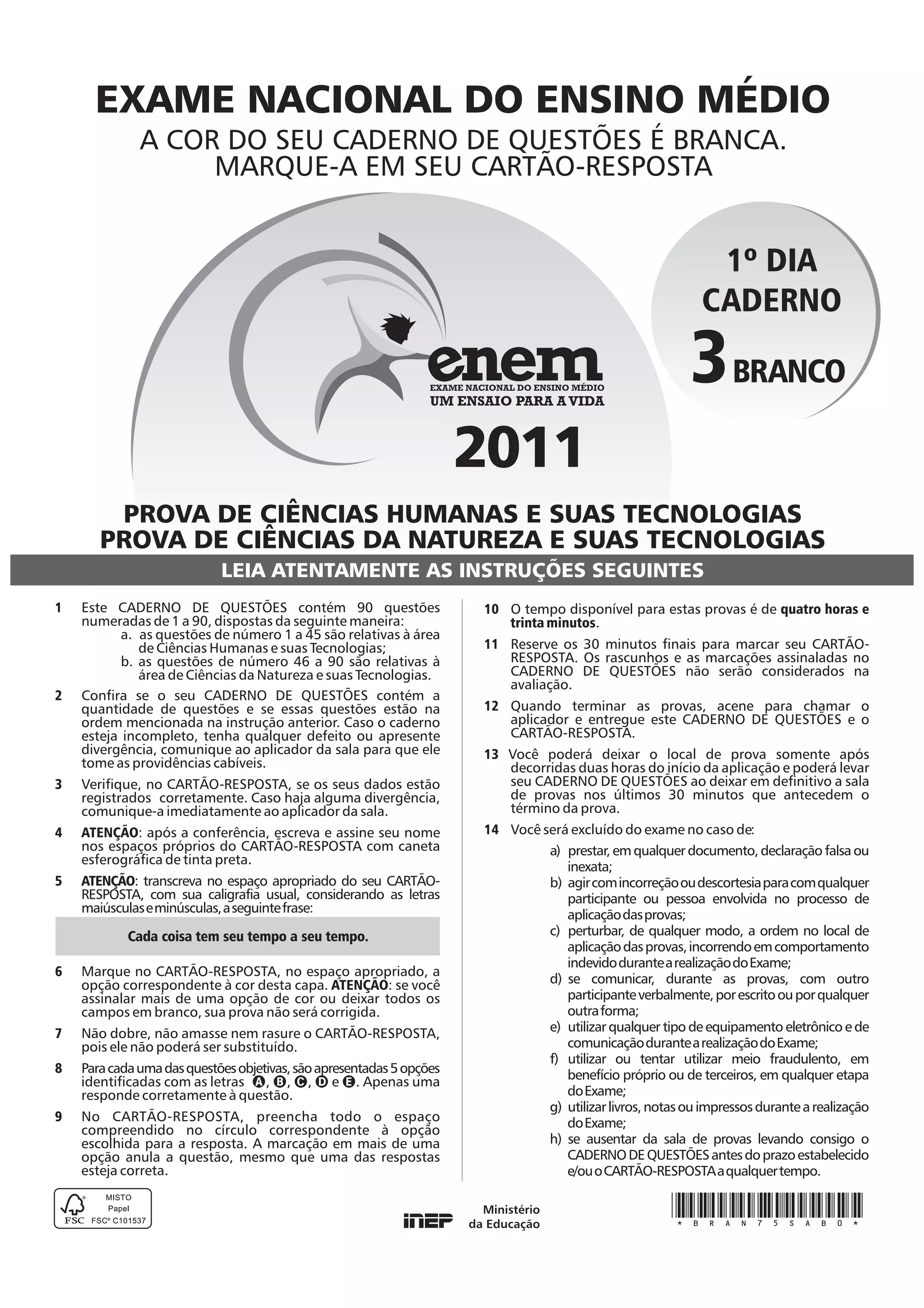 1) O documento descreve as instruções para a realização da prova do Exame Nacional do Ensino Médio, incluindo informações sobre o caderno de questões, o cartão-resposta e as regras da prova.