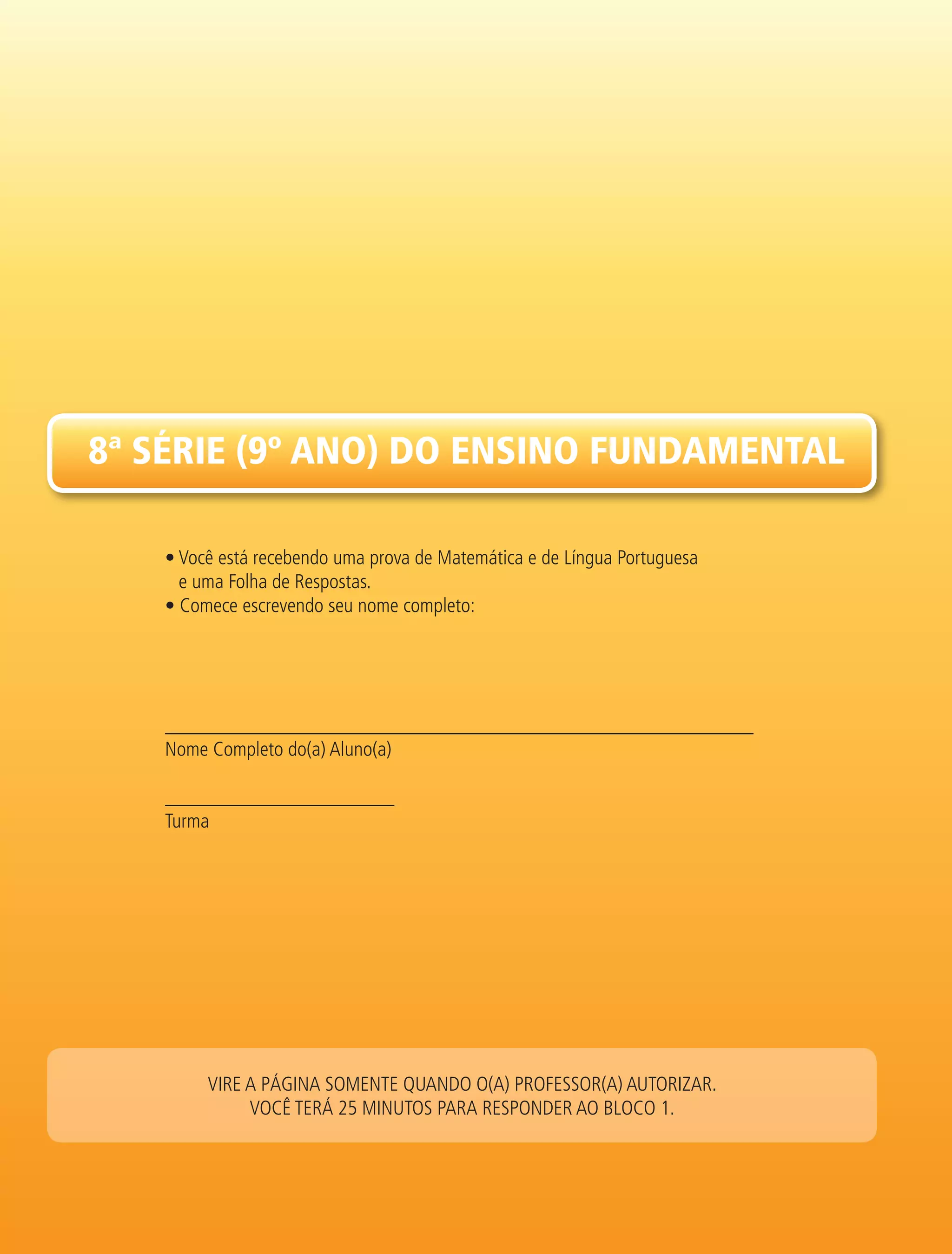 O documento apresenta um teste de Matemática e Português para alunos do 8o ano do ensino fundamental. O teste contém questões de múltipla escolha sobre assuntos como geometria, porcentagem, sistemas de equações e interpretação de texto. Os alunos terão 25 minutos para responder ao primeiro bloco de questões de Matemática.