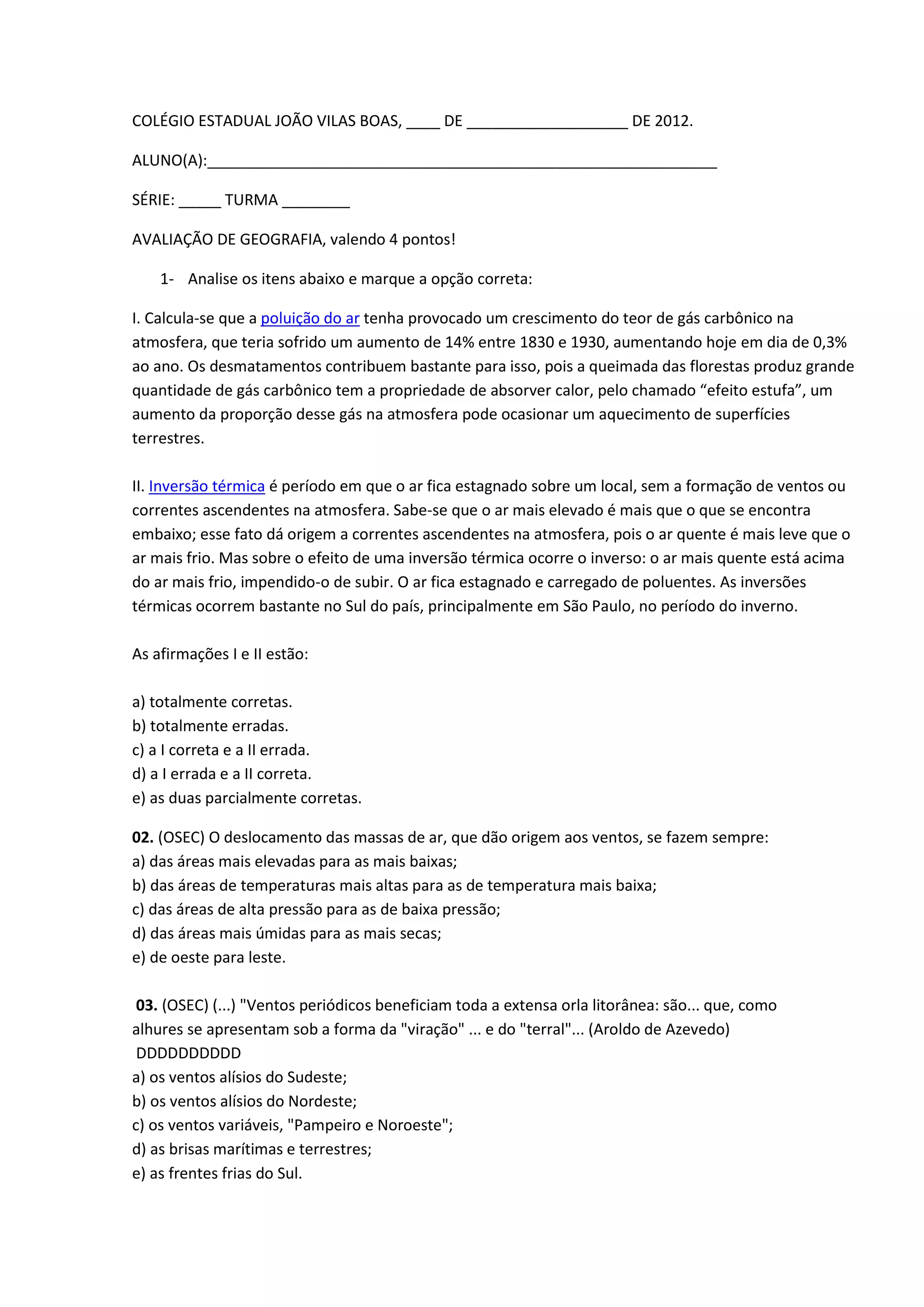 O documento trata de um teste de geografia com questões sobre poluição do ar, efeito estufa, inversão térmica, ventos e correntes atmosféricas e marítimas. O teste inclui questões de múltipla escolha sobre as causas do aumento de gás carbônico na atmosfera, características de inversão térmica, e origem dos ventos, além de pedir comentários sobre massas de ar, El Niño, correntes marítimas e inversão térmica.