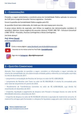 Este documento fornece um resumo comentado de uma prova de Contabilidade Pública aplicada no concurso da CLDF para o cargo de Consultor Técnico Legislativo - Contador. O resumo inclui considerações iniciais sobre a prova, comentários detalhados sobre cada questão e o gabarito, além de uma lista das questões.