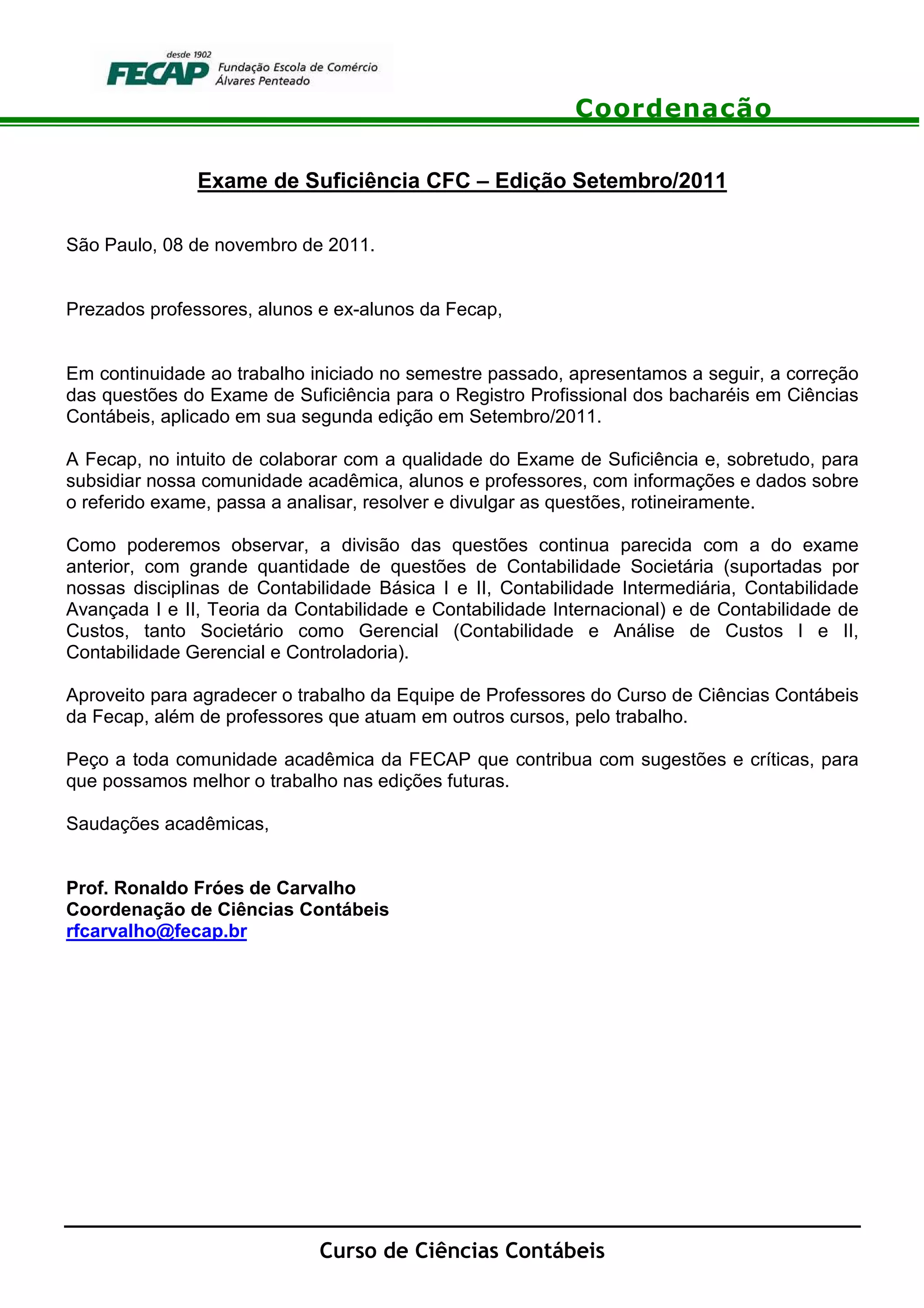O documento resume as informações sobre a correção das questões do Exame de Suficiência para o Registro Profissional dos bacharéis em Ciências Contábeis, aplicado em Setembro/2011. A Fecap analisou, resolveu e divulgou as questões do exame para subsidiar os alunos, professores e comunidade acadêmica com informações sobre o exame. A equipe de professores do curso de Ciências Contábeis da Fecap realizou o trabalho de correção e o coordenador agradece a colaboração.