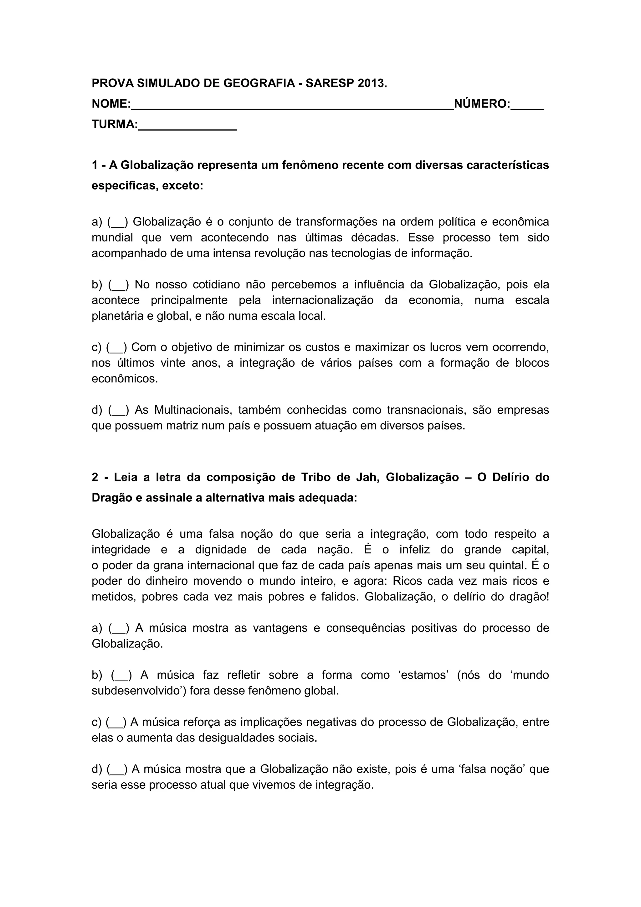 PROVA SIMULADO DEGEOGRAFIA - SARESP 2013.