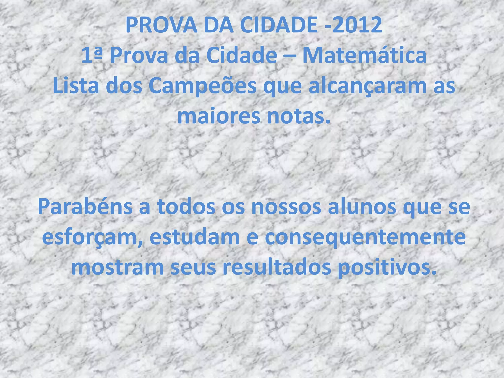 Este documento lista os alunos de diferentes classes que alcançaram as maiores notas na 1a Prova da Cidade de 2012 em Matemática, parabenizando o esforço de todos os estudantes.