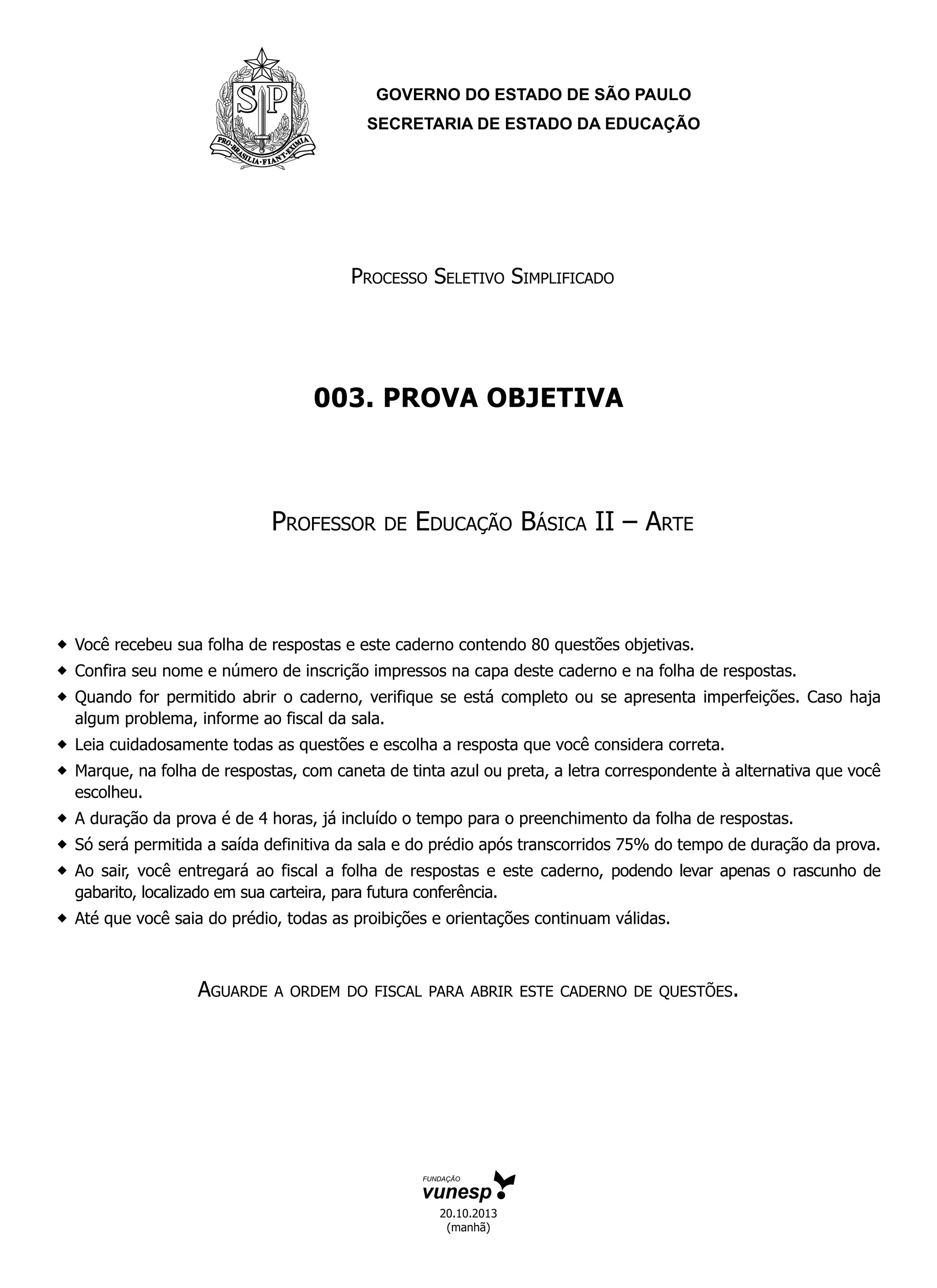Este documento fornece instruções sobre uma prova objetiva para o processo seletivo simplificado de professor de Educação Básica II - Arte. O documento informa que a prova contém 80 questões objetivas e terá a duração de 4 horas. Os candidatos devem conferir seus nomes e números de inscrição e aguardar a ordem do fiscal para iniciar a prova.