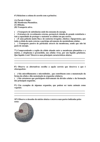 1) O documento é uma avaliação de biologia sobre células. 2) Ele aborda as diferenças entre células procariotas e eucariotas, além de questões sobre estruturas celulares como membrana plasmática, citoplasma e organelas. 3) O aluno deve identificar, comparar e associar conceitos-chave sobre as características e componentes das células.