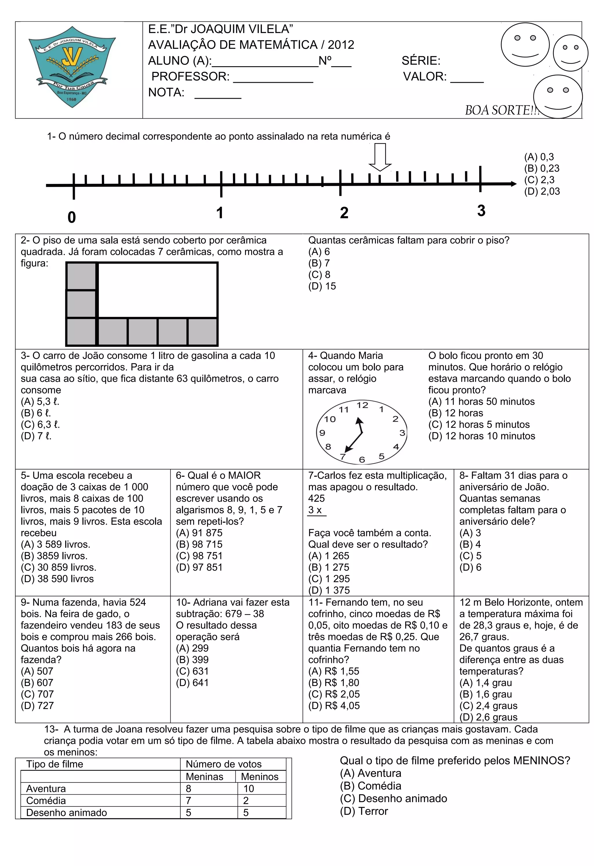 AVALIAÇÂO DE MATEMÁTICA / 2012