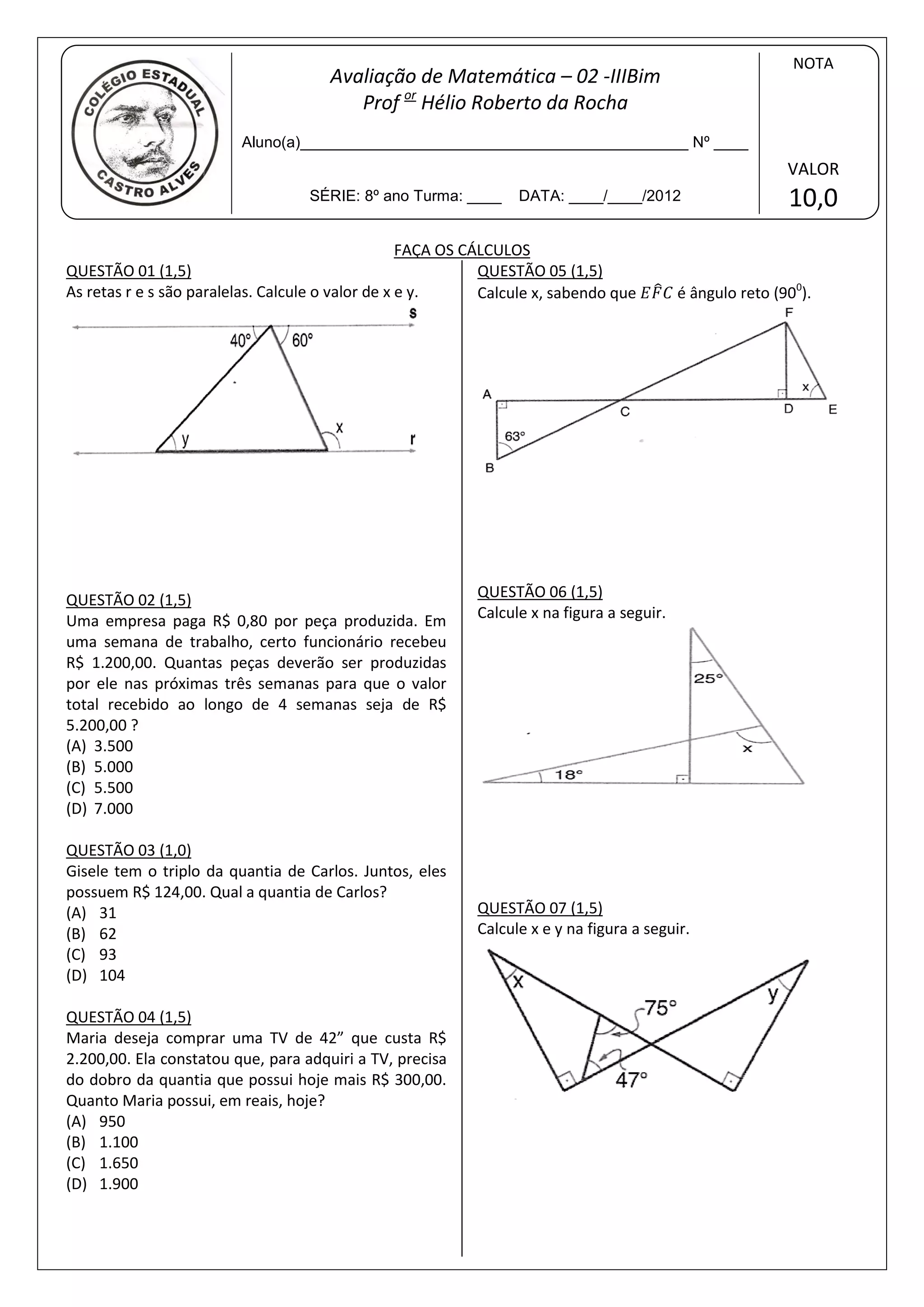 O documento é uma prova de matemática contendo 7 questões. As questões envolvem cálculos geométricos e algébricos como determinar valores desconhecidos em figuras, calcular produção de peças com base em valor recebido, e determinar quantias com base em informações sobre posses de pessoas.