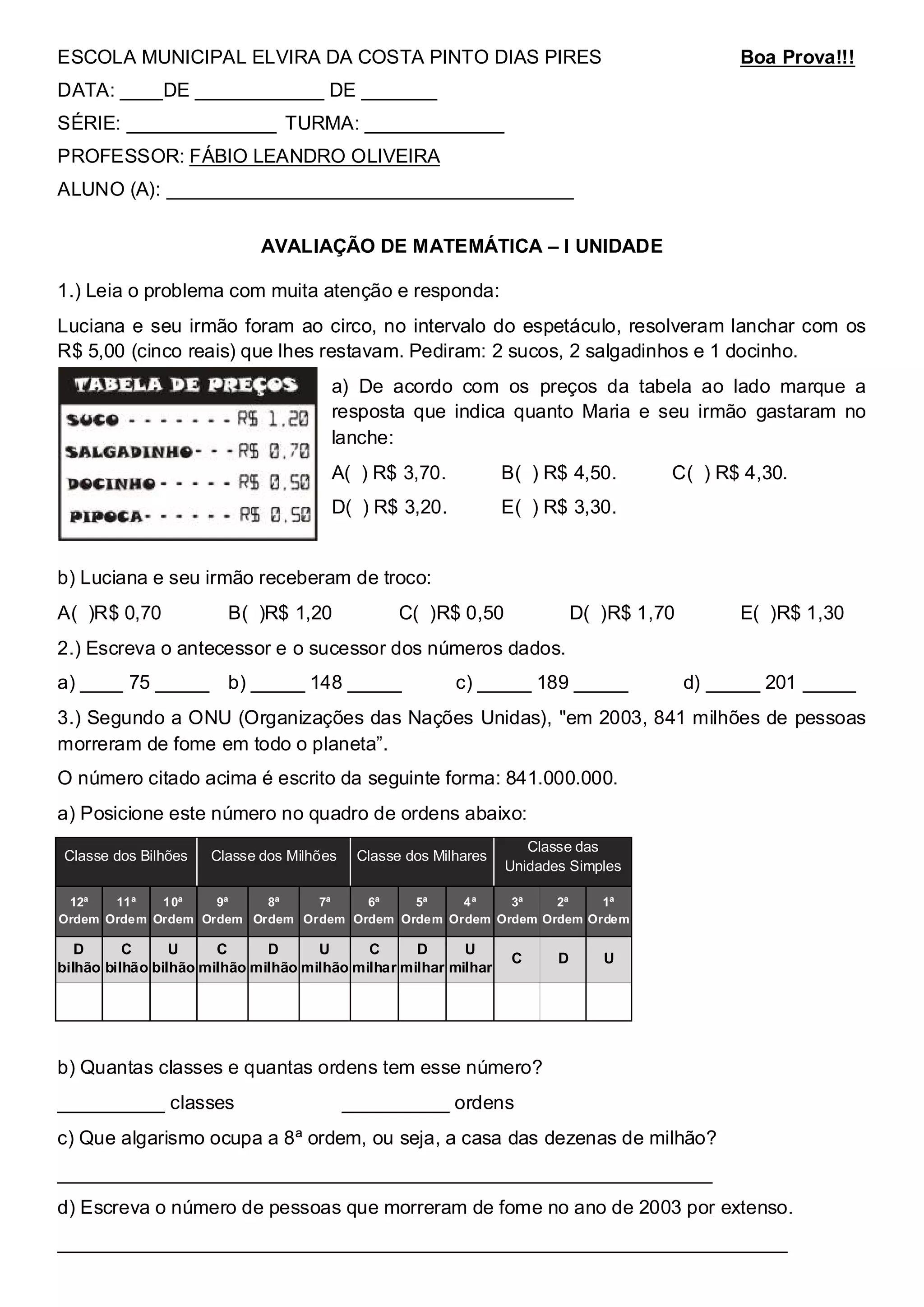 1) O documento é uma prova de matemática para alunos do ensino fundamental contendo 6 questões. As questões abordam tópicos como operações com números, posicionamento de números em classes e ordens, leitura de números ordinais e resolução de problemas matemáticos.