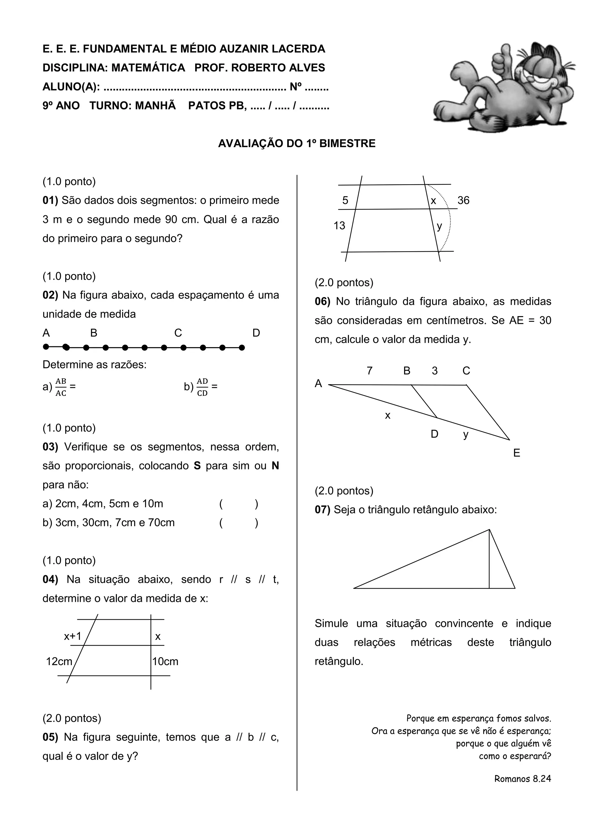 4914900-114300E. E. E.FUNDAMENTAL E MÉDIO AUZANIR LACERDA<br />DISCIPLINA: MATEMÁTICA PROF. ROBERTO ALVES<br />ALUNO(A): ............................................................ Nº ........ <br />9º ANO TURNO: MANHÃ PATOS PB, ..... / ..... / ..........<br />AVALIAÇÃO DO 1º BIMESTRE<br />(1.0 ponto) <br />01) São dados dois segmentos: o primeiro mede 3 m e o segundo mede 90 cm. Qual é a razão do primeiro para o segundo?<br />(1.0 ponto) <br />02) Na figura abaixo, cada espaçamento é uma unidade de medida<br />A B C D<br />Determine as razões:<br />a) ABAC = b) ADCD = <br />(1.0 ponto) <br />03) Verifique se os segmentos, nessa ordem, são proporcionais, colocando S para sim ou N para não:<br />a) 2cm, 4cm, 5cm e 10m()<br />b) 3cm, 30cm, 7cm e 70cm()<br />(1.0 ponto) <br />04) Na situação abaixo, sendo r // s // t, determine o valor da medida de x:<br /> <br /> x+1 x<br /> 12cm 10cm<br />(2.0 pontos) <br />05) Na figura seguinte, temos que a // b // c, qual é o valor de y?<br /> 5 x 36<br /> 13 y<br />(2.0 pontos) <br />06) No triângulo da figura abaixo, as medidas são consideradas em centímetros. Se AE = 30 cm, calcule o valor da medida y.<br /> 7 B 3 C<br />A<br /> <br /> x<br /> D y<br /> E<br />(2.0 pontos) <br />07) Seja o triângulo retângulo abaixo:<br />Simule uma situação convincente e indique duas relações métricas deste triângulo retângulo.<br />Porque em esperança fomos salvos.<br />Ora a esperança que se vê não é esperança;<br />porque o que alguém vê<br />como o esperará?<br />Romanos 8.24<br />
