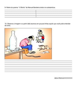 O poema "O Bicho" de Manuel Bandeira descreve um homem faminto catando comida entre os detritos em um pátio sujo. O autor usa a palavra "bicho" para mostrar como o homem se viu reduzido à condição de um animal em busca de sobrevivência. A intenção do poema é chocar o leitor e despertar pena pela triste situação da humanidade.