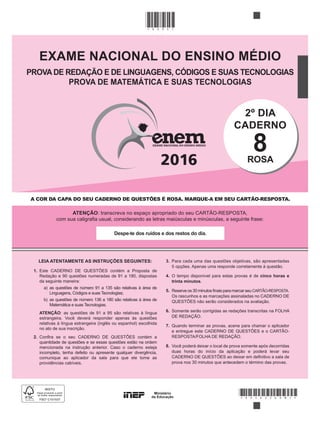 O documento fornece instruções sobre uma prova do Exame Nacional do Ensino Médio, indicando: 1) a cor da capa do caderno de questões é rosa; 2) o caderno contém questões de Linguagens e Matemática; 3) há orientações sobre como preencher o cartão-resposta e realizar a redação.