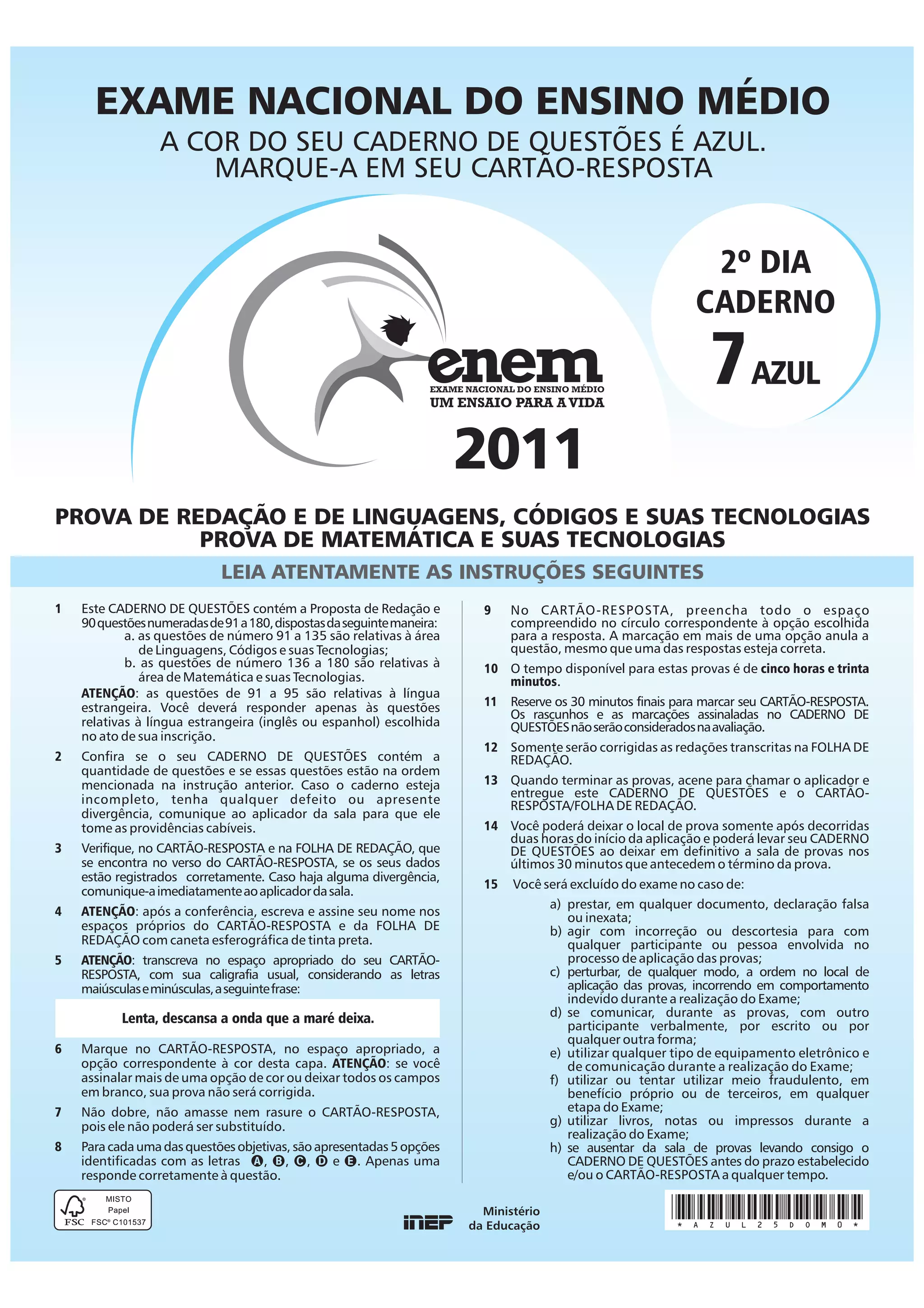 O documento apresenta as instruções para a realização da prova do Exame Nacional do Ensino Médio (ENEM). Informa que o caderno de questões é azul e contém questões de Linguagens, Códigos e suas Tecnologias e de Matemática e suas Tecnologias. Orienta sobre o preenchimento do cartão-resposta, o tempo de duração da prova, a transcrição da redação e as regras de conduta. A proposta de redação pede um texto dissertativo-argumentativo sobre os limites entre o público e o