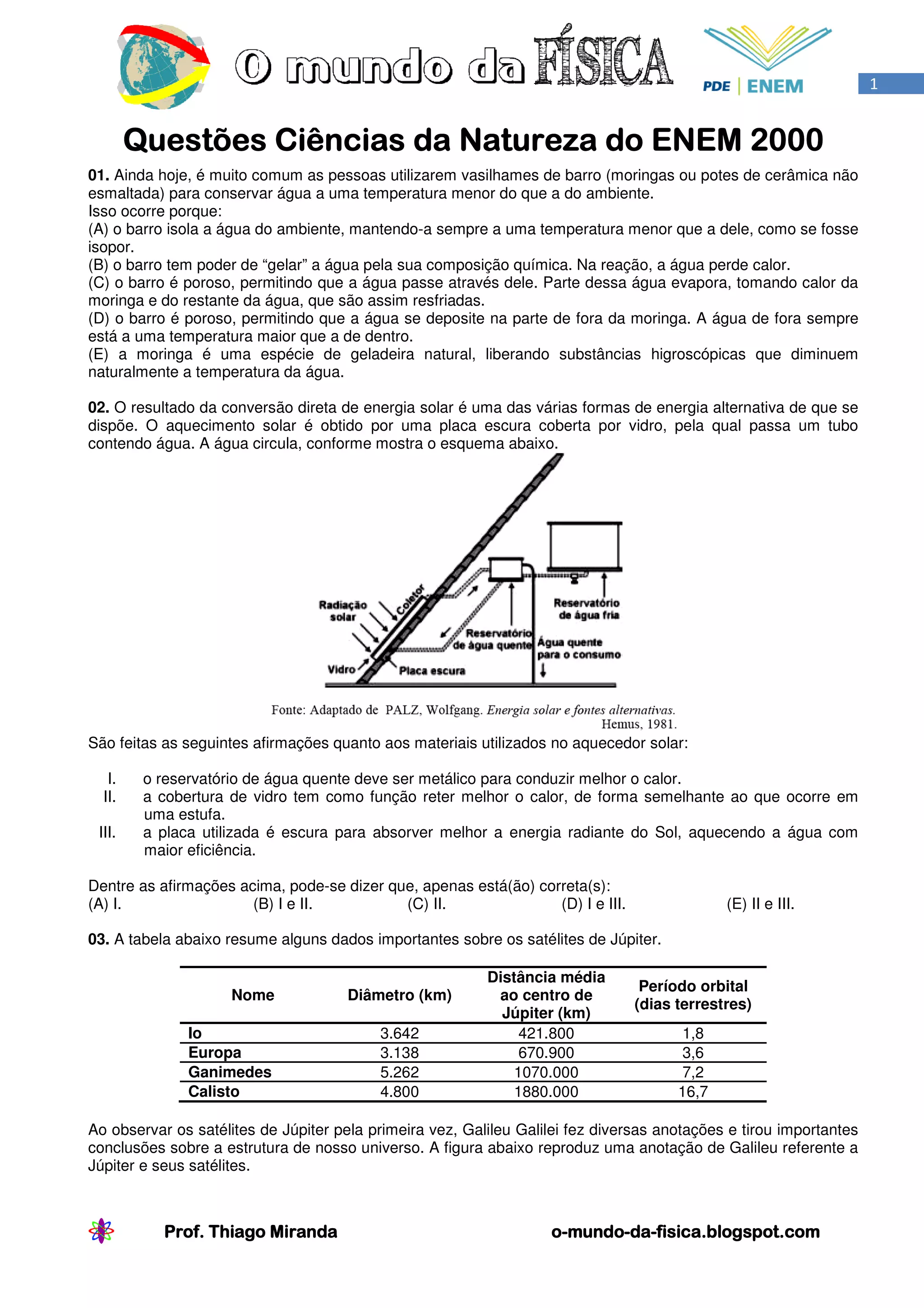 2) O documento apresenta sete questões sobre conceitos de física, incluindo aquecimento solar, satélites de Júpiter e geração de energia nuclear.