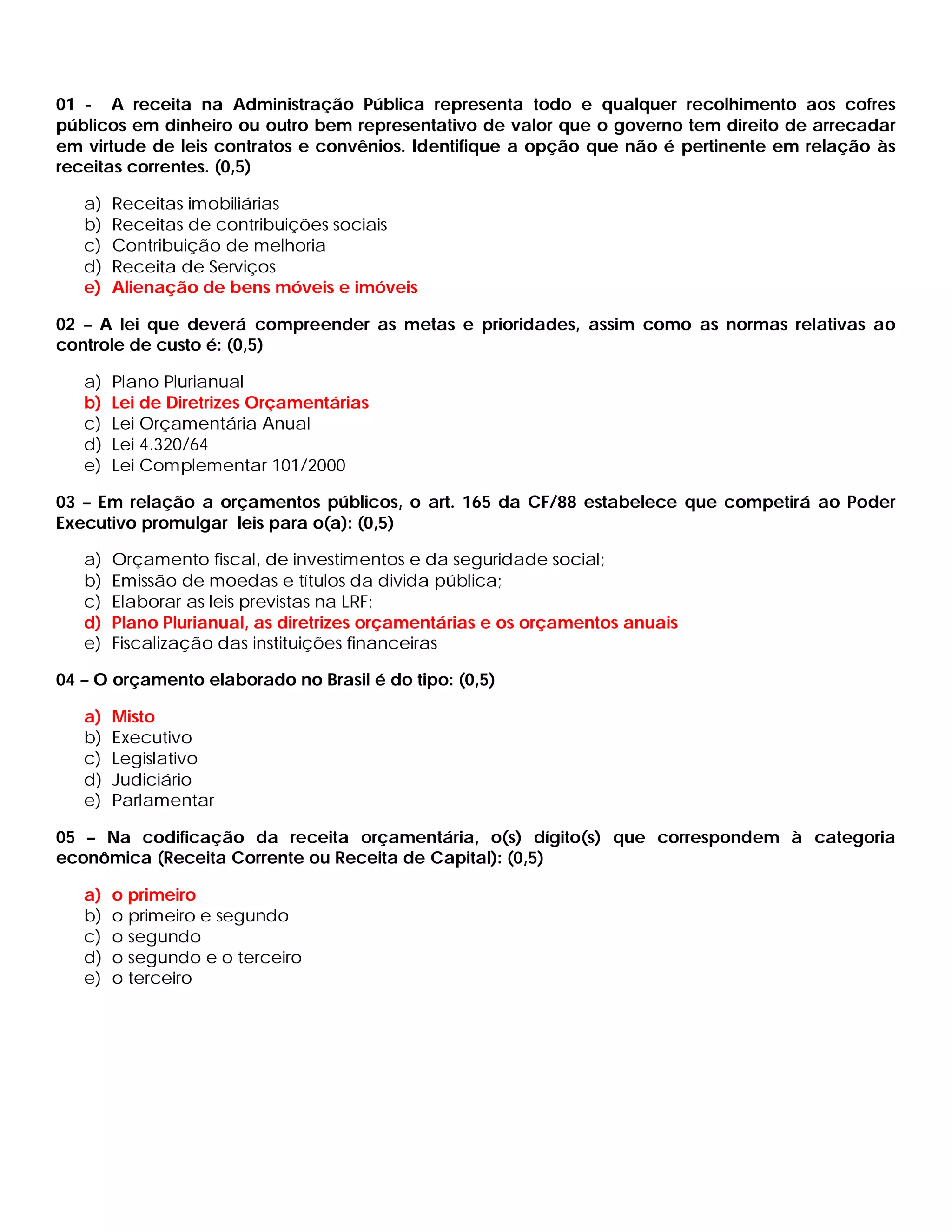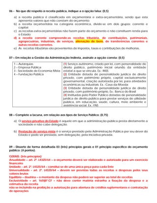 O documento apresenta 10 questões sobre orçamento público e administração pública. As questões abordam conceitos como receitas orçamentárias, leis orçamentárias, tipos de orçamento, princípios orçamentários e da administração pública.