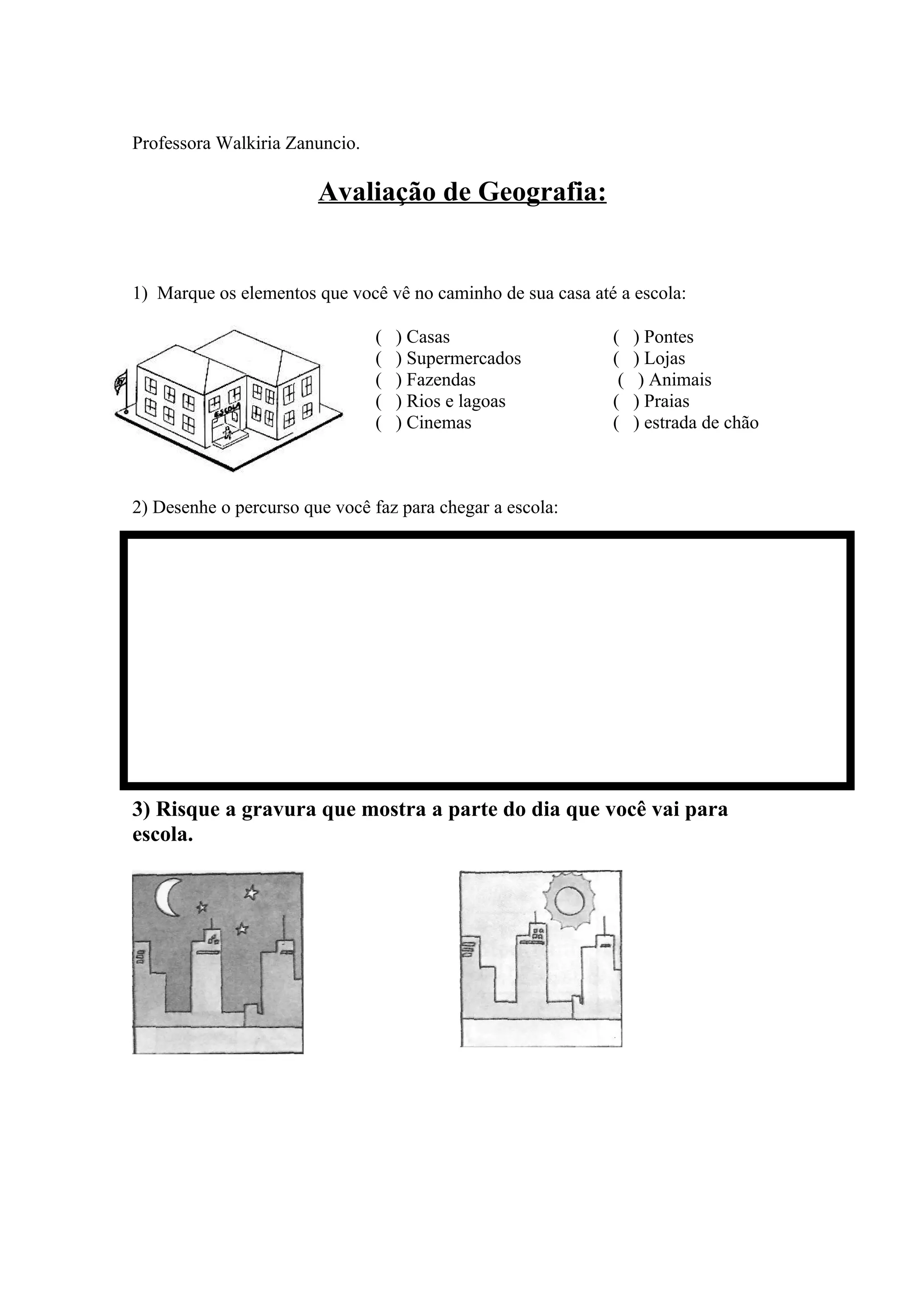A avaliação de geografia pede para o aluno marcar elementos que vê no caminho para a escola, desenhar o percurso, riscar a gravura que mostra a parte do dia em que vai para a escola, desenhar o que vê no céu durante a noite, ajudar crianças a levar mudas de árvores para a floresta, e representar a sala de aula em forma de mapa.