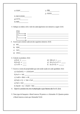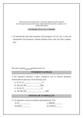 Este documento contém um resumo de uma atividade final de matemática com 10 questões sobre números naturais, sistema de numeração, operações matemáticas básicas e resolução de problemas. As questões abordam tópicos como quantidades não ocupadas em um avião, sequências numéricas, escrita e leitura de números romanos e arábicos, ordens e valores de algarismos, produtos, propriedades matemáticas e resolução de problemas envolvendo subtração e multiplicação.