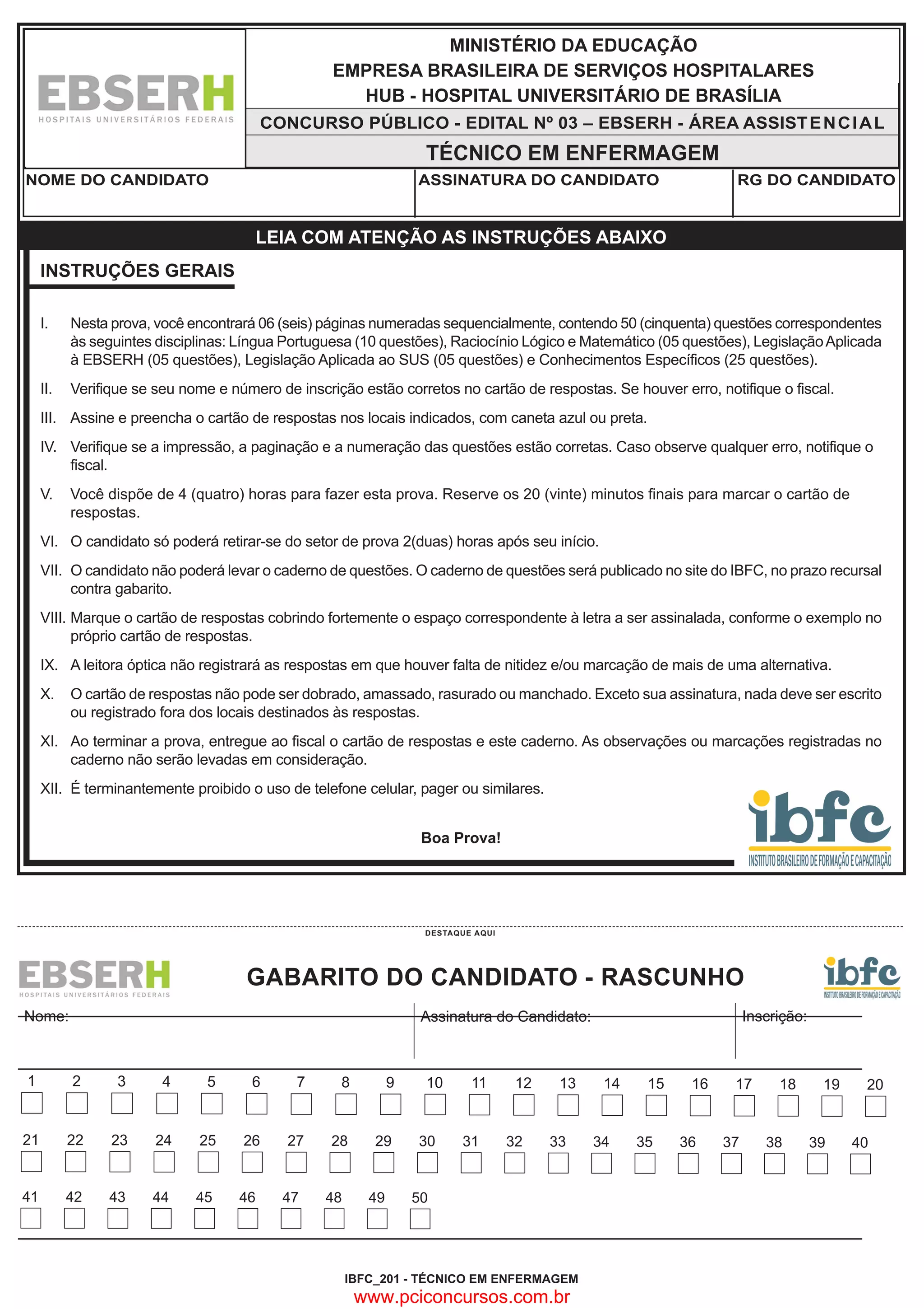 O documento trata de um concurso público para técnico em enfermagem realizado pela EBSERH (Empresa Brasileira de Serviços Hospitalares). Ele contém instruções gerais sobre a prova, informando que terá questões de língua portuguesa, raciocínio lógico e matemático, legislação aplicada à EBSERH e ao SUS, e conhecimentos específicos. Também instrui o candidato sobre preenchimento do cartão de respostas e outras regras da prova.