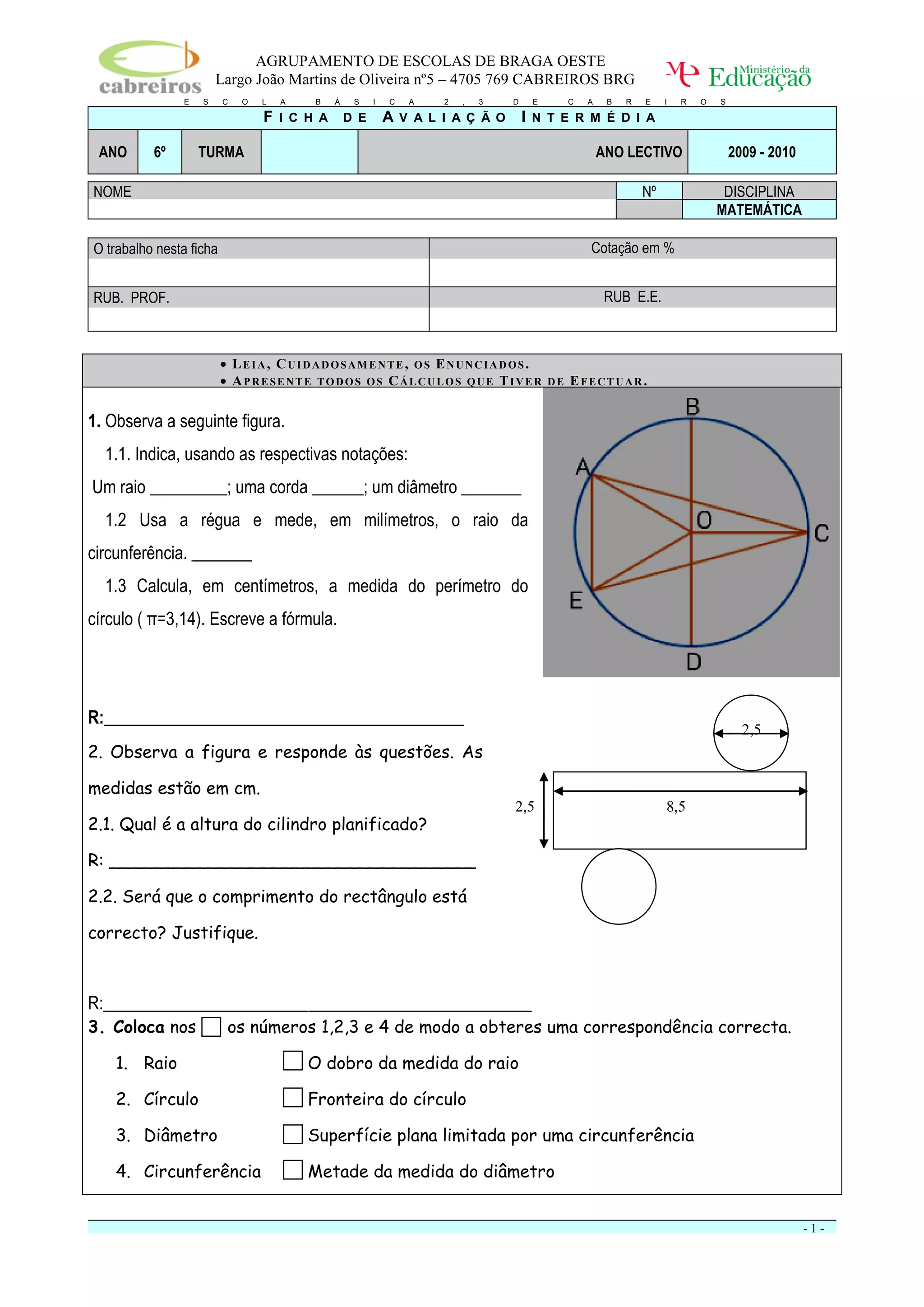 O documento apresenta um teste de matemática com 13 questões sobre conceitos geométricos como círculo, raio, diâmetro e circunferência. Inclui também questões sobre frações, porcentagens e resolução de problemas. O teste avalia conceitos e procedimentos matemáticos, resolução de problemas e raciocínio lógico.