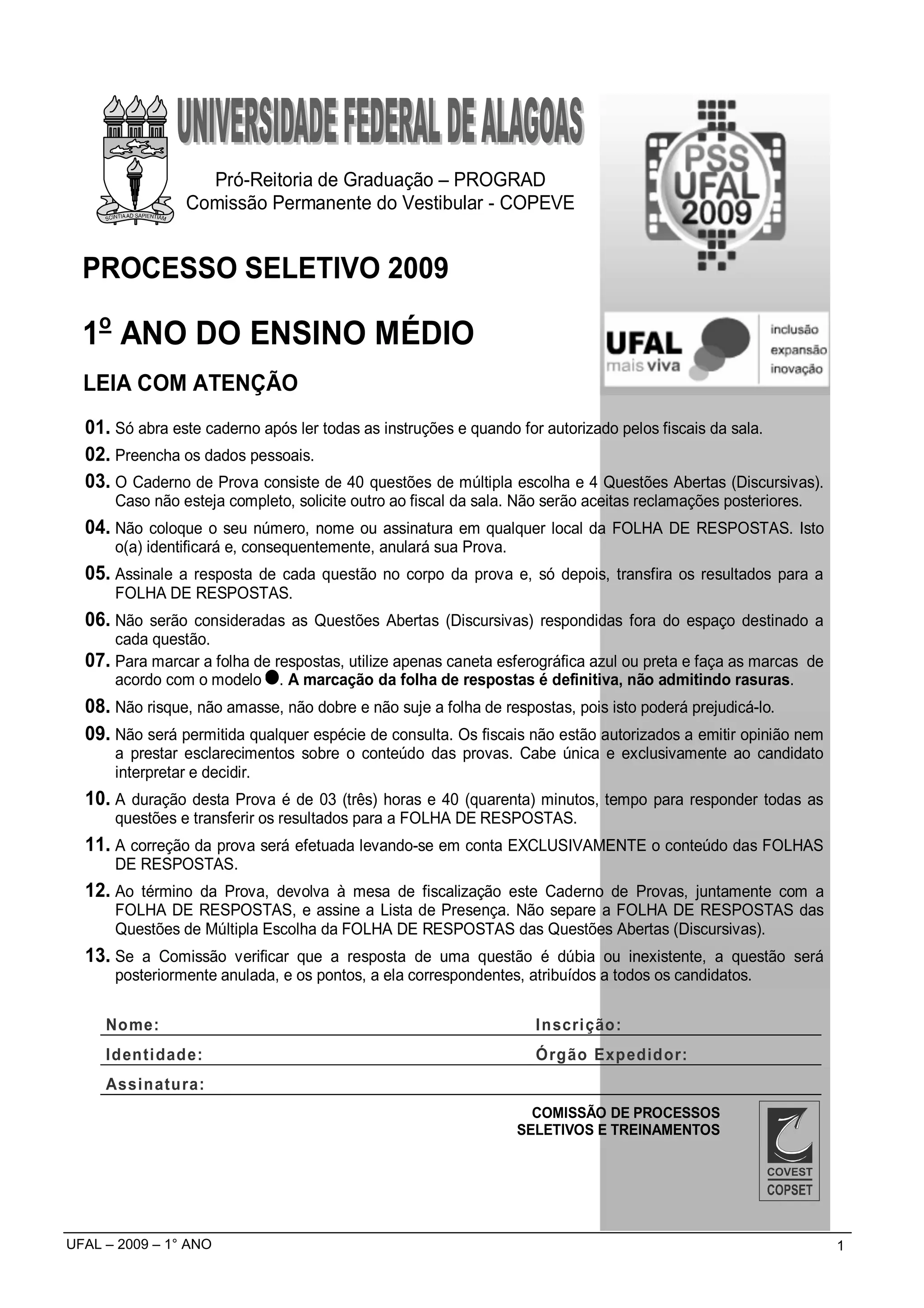 Este documento fornece instruções para a realização de um processo seletivo para o 1o ano do ensino médio. Ele contém 13 itens que orientam os candidatos sobre como preencher a ficha de identificação, o tempo de duração da prova, as regras de preenchimento da folha de respostas e o que fazer ao final da prova.