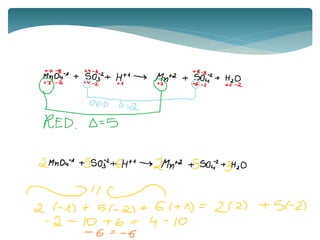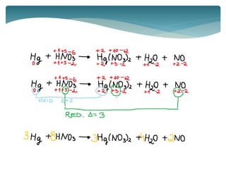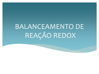 O documento discute métodos de balanceamento de equações redox, incluindo redução redox total e parcial. Também explica cálculos químicos como número de Avogadro e funções inorgânicas como ácidos, bases, sais, óxidos e hidróxidos.