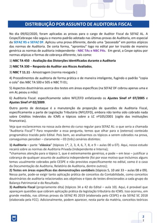 1) Uma análise da distribuição dos assuntos cobrados, com foco maior em normas atípicas e procedimentos de auditoria;