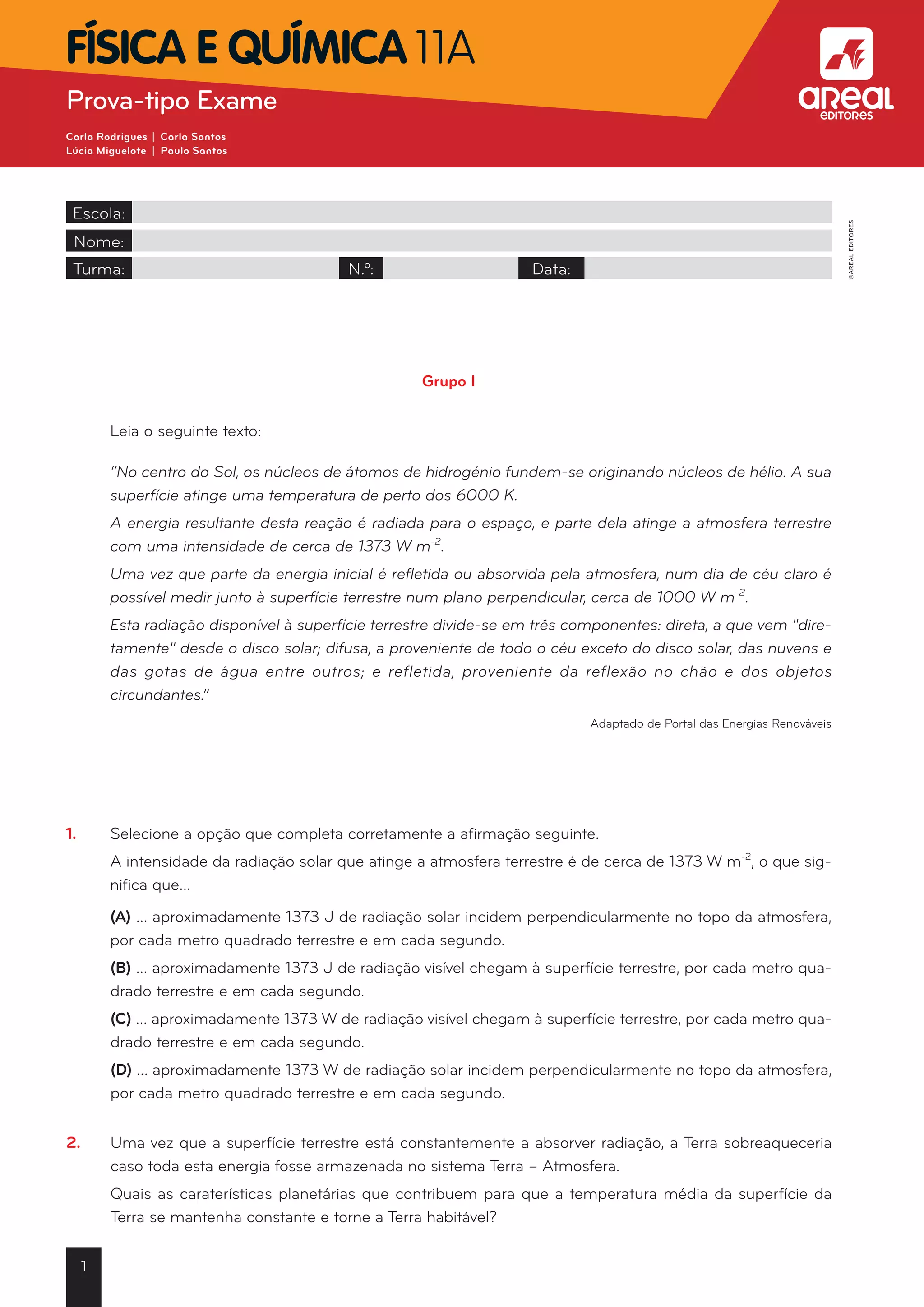 1) O Sol produz energia através da fusão de átomos de hidrogênio em hélio em seu núcleo. Parte desta energia atinge a Terra com uma intensidade de cerca de 1373 W/m2.