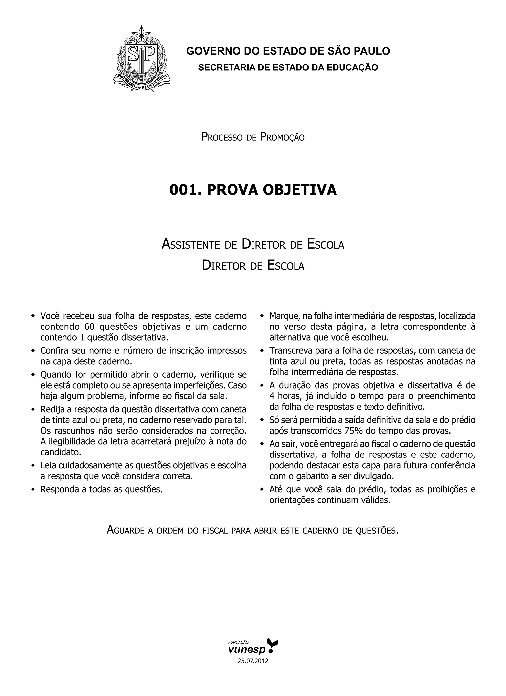 Este documento descreve as instruções para a realização de uma prova objetiva e dissertativa para o processo de promoção de Assistente de Diretor de Escola e Diretor de Escola. O documento explica que os candidatos receberão uma folha de respostas e um caderno de questões, contendo 60 questões objetivas e 1 questão dissertativa. As provas terão duração de 4 horas e os candidatos só poderão sair depois de 75% do tempo. Ao saírem, os candidatos deverão entregar os materiais aos fiscais.