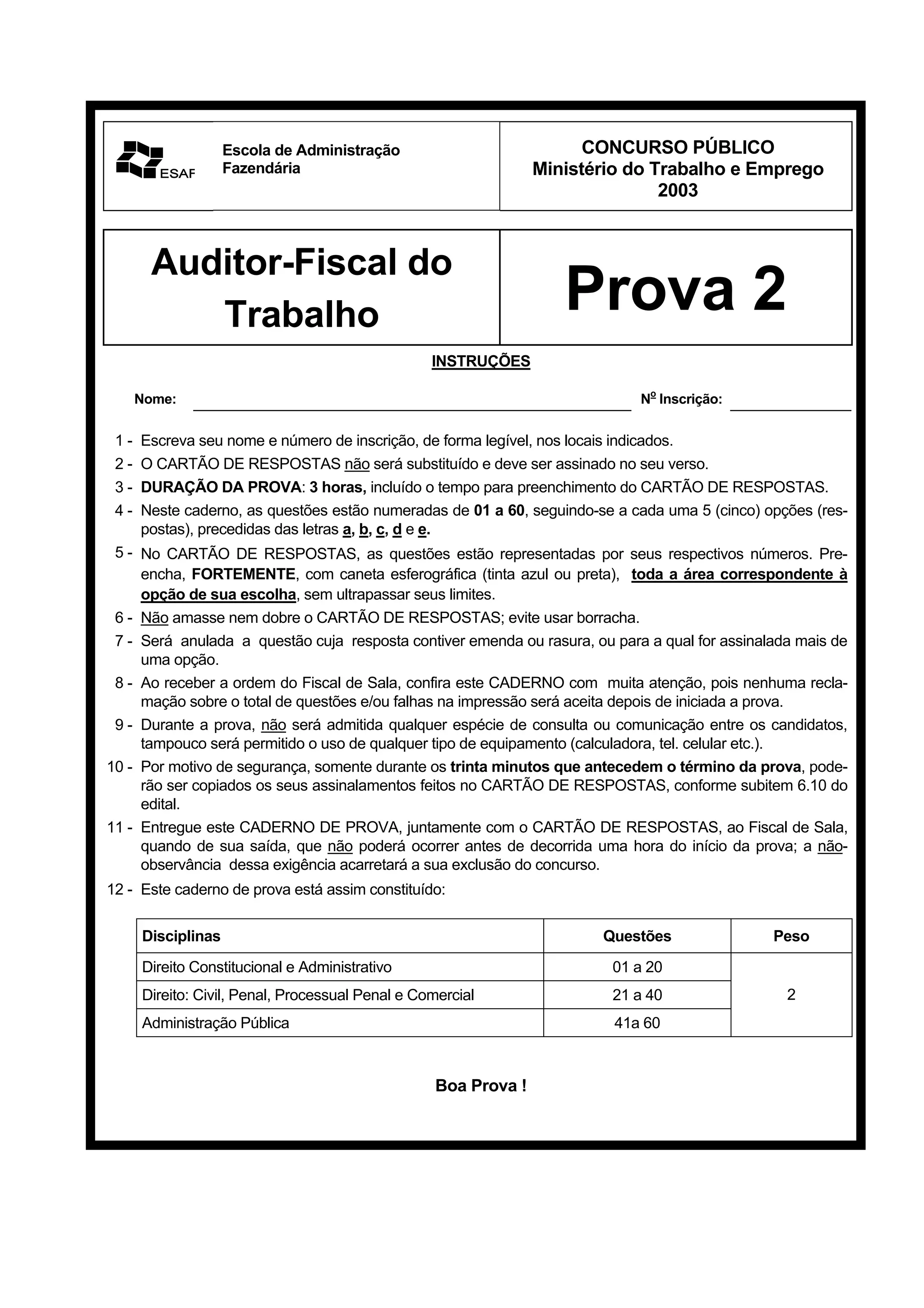 Este documento apresenta instruções para a realização da prova de concurso público para Auditor-Fiscal do Trabalho do Ministério do Trabalho e Emprego em 2003. A prova terá duração de 3 horas e abrangerá questões de Direito Constitucional e Administrativo, Direito Civil, Penal, Processual Penal e Comercial e Administração Pública. As instruções incluem orientações sobre preenchimento do cartão de respostas, proibição de consulta durante a prova e entrega dos documentos ao final.