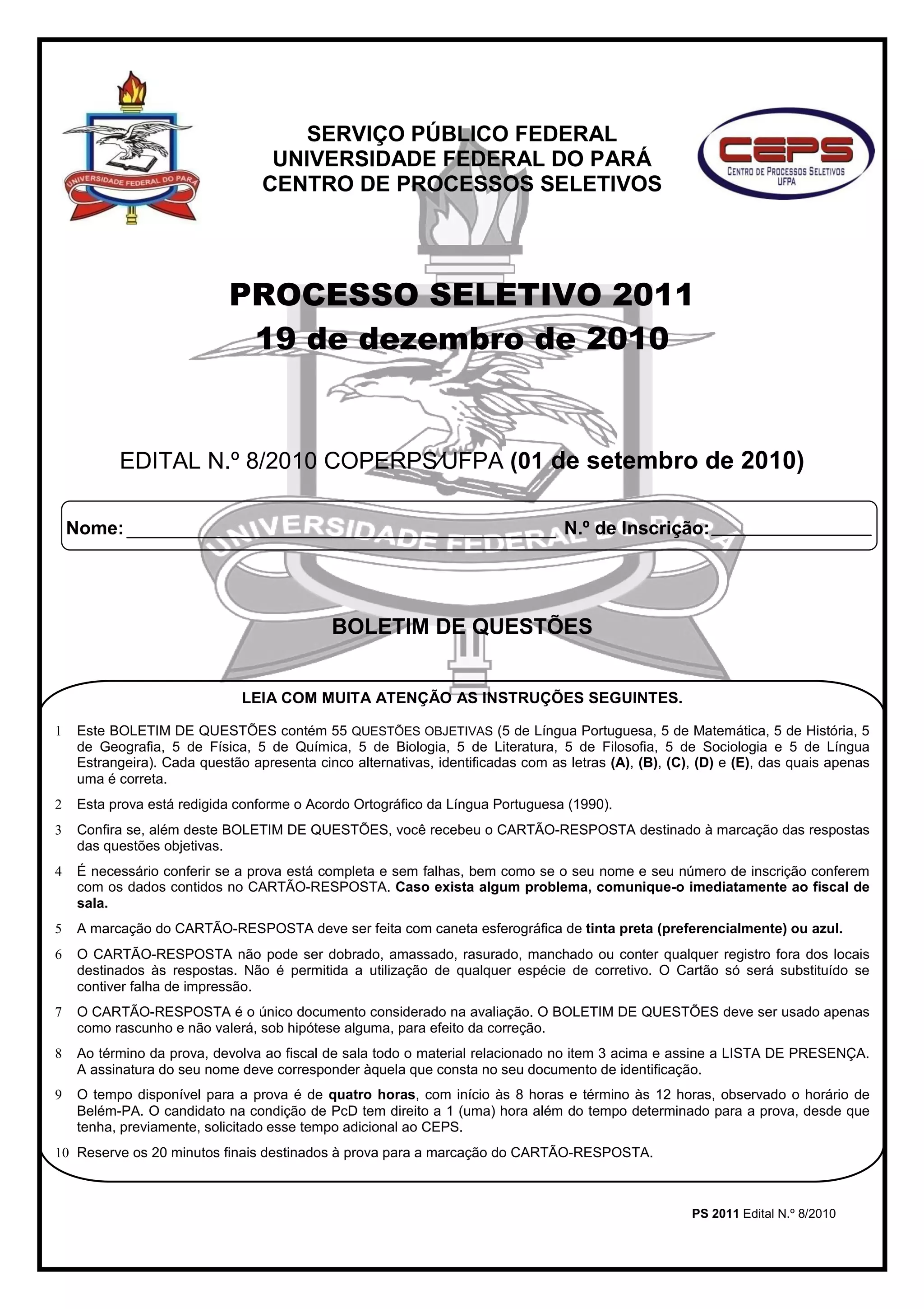 1. O documento é um boletim de questões para um processo seletivo da Universidade Federal do Pará em 2011.