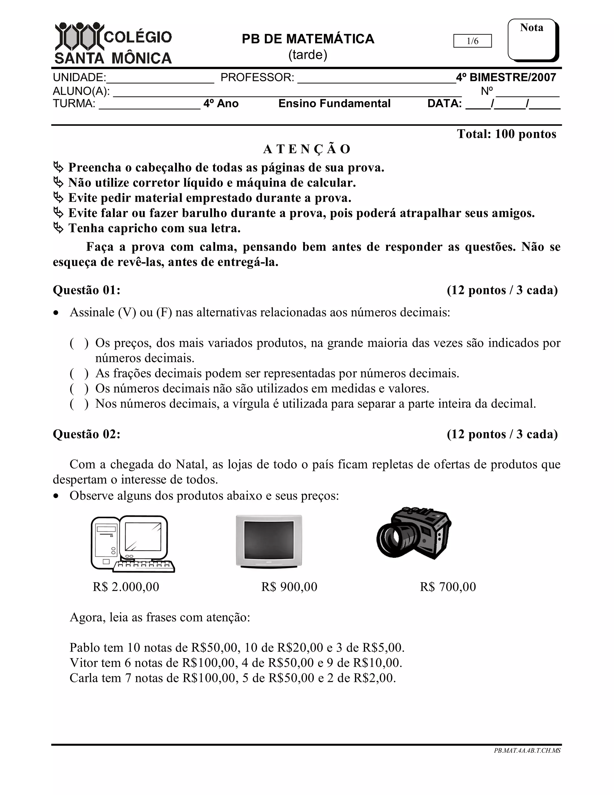 Este documento é uma prova de matemática do 4o ano do ensino fundamental. A prova contém 11 questões sobre números decimais, cálculos monetários, medidas de comprimento, área e volume. Os alunos devem demonstrar seu conhecimento sobre esses tópicos matemáticos.