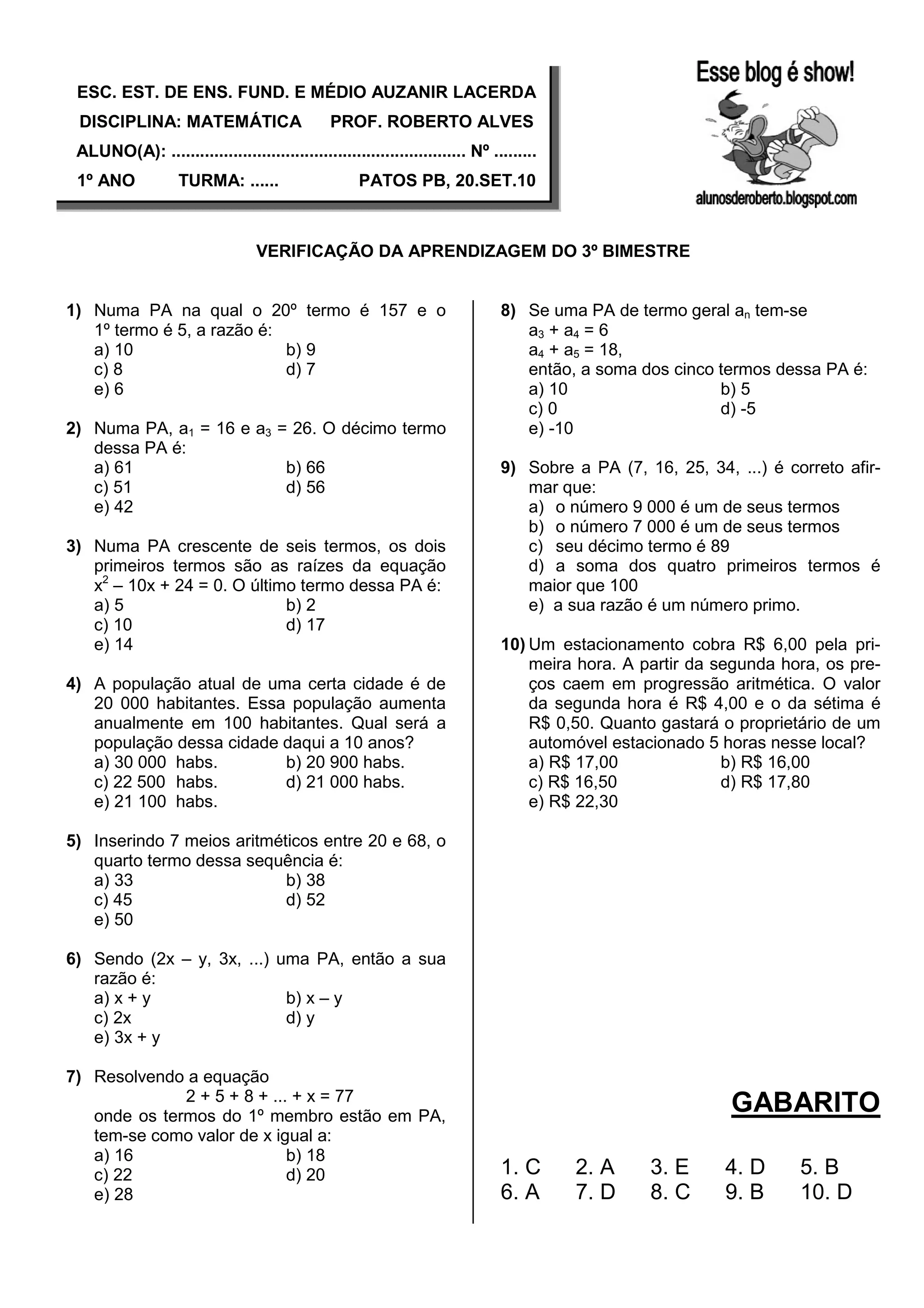 1) O documento apresenta 10 questões de matemática sobre progressão aritmética.