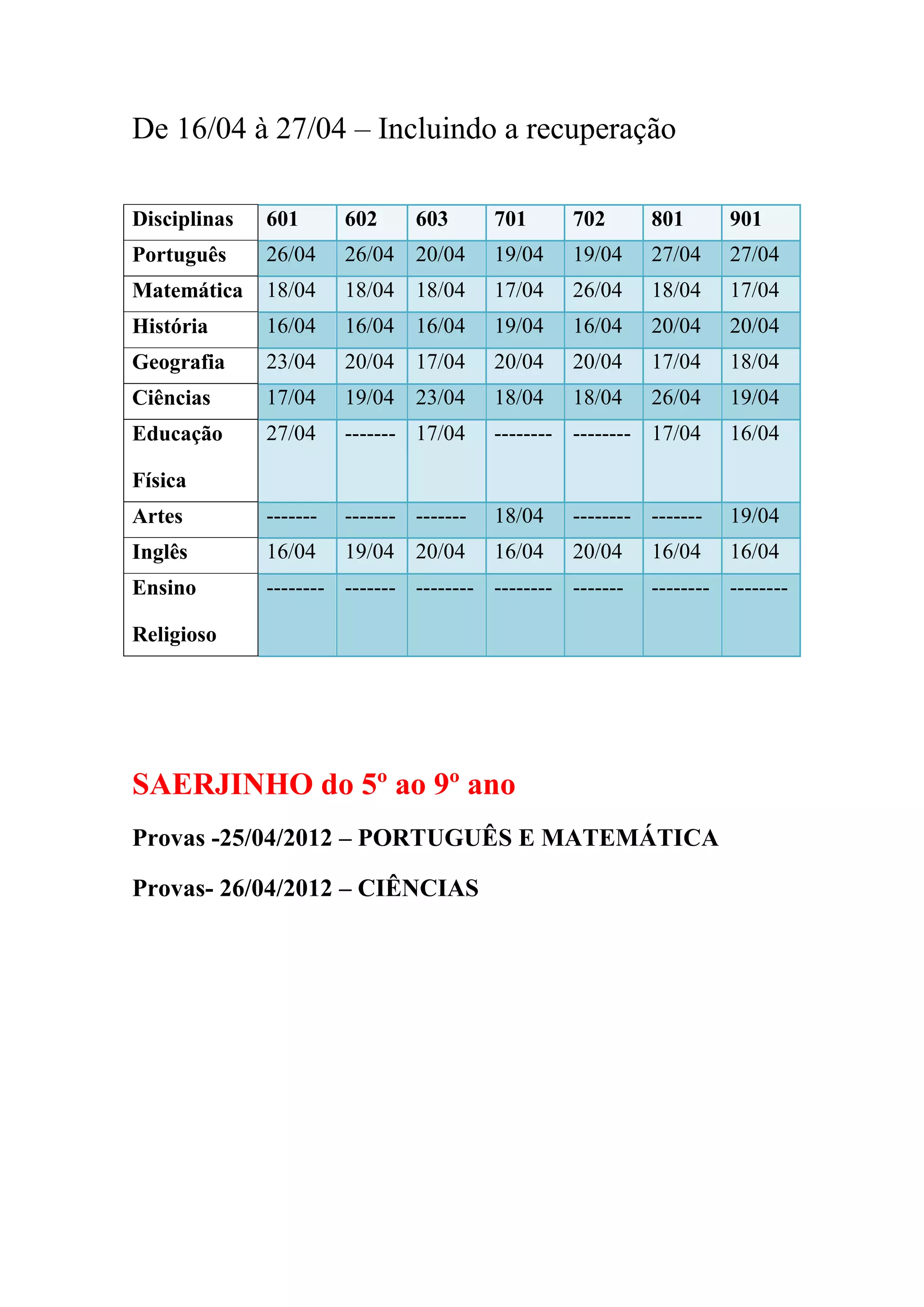 O documento apresenta o cronograma de provas de diferentes disciplinas para alunos dos 5o ao 9o ano entre 16 de abril e 27 de abril, incluindo a recuperação, com destaque para as provas de português e matemática em 25 de abril e ciências em 26 de abril.