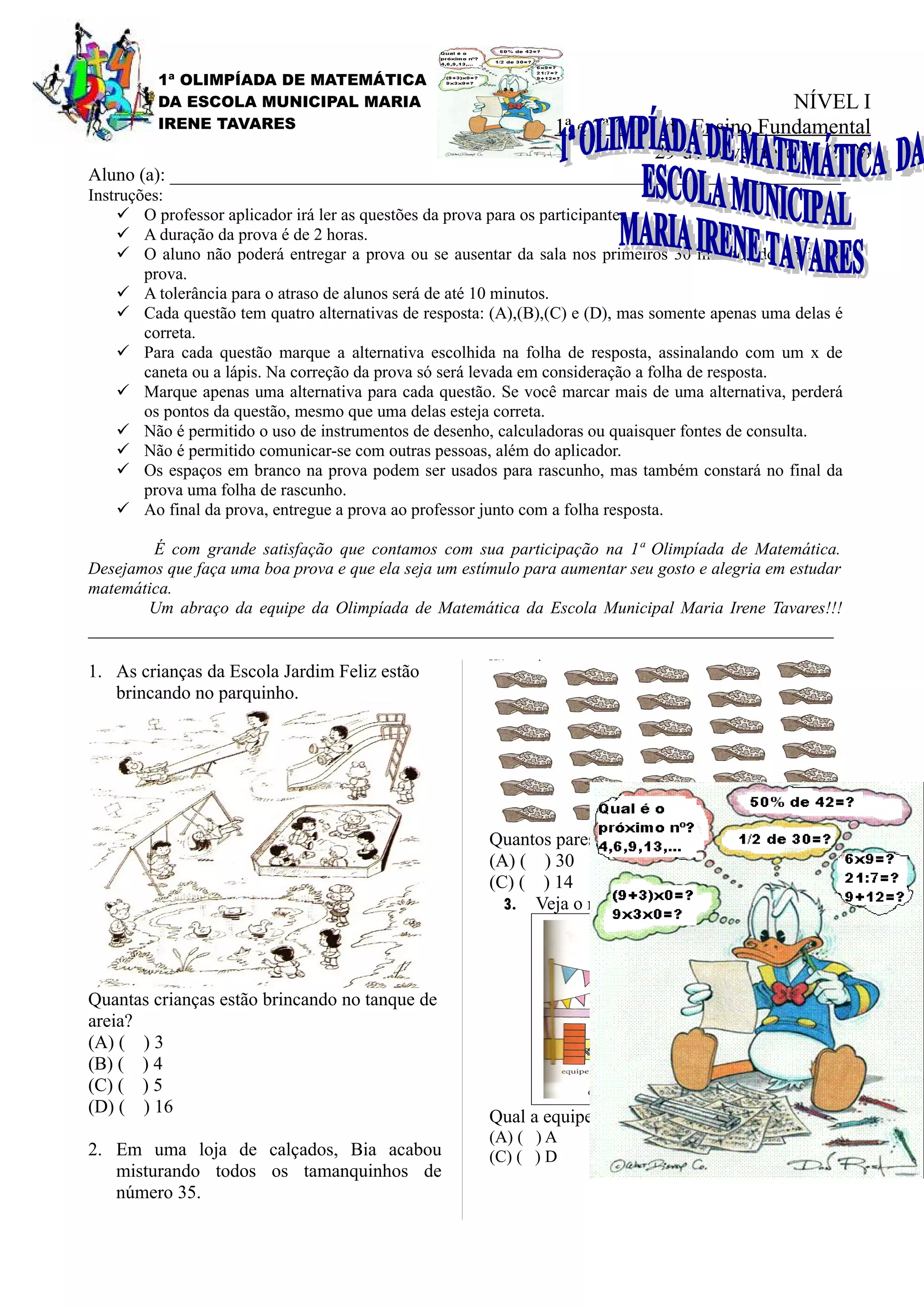 1) O documento é sobre a 1a Olimpíada de Matemática da Escola Municipal Maria Irene Tavares, com instruções para os alunos participantes.