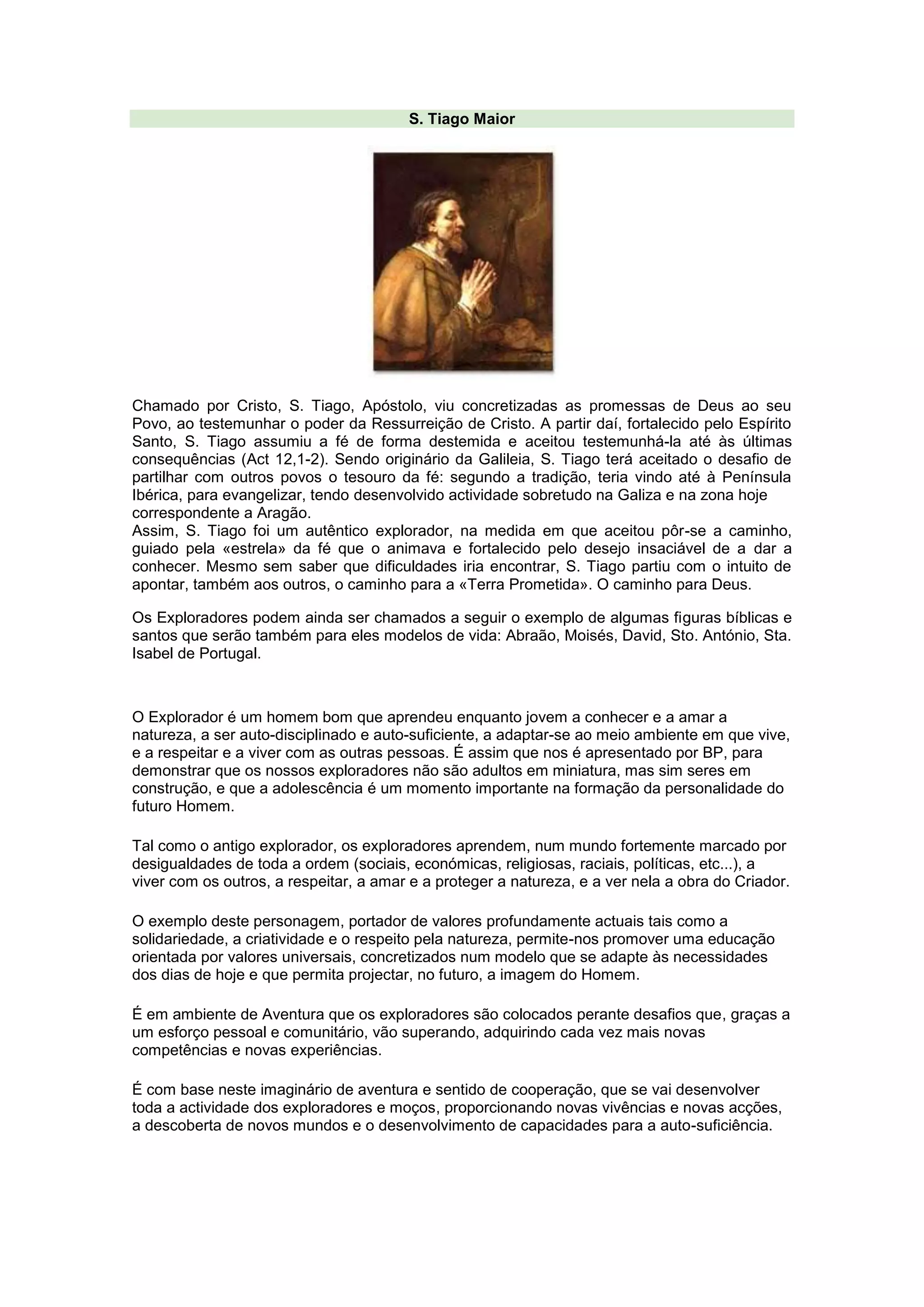 S. Tiago Maior, um dos doze apóstolos de Cristo, teria viajado para a Península Ibérica para evangelizar. De acordo com a tradição, S. Tiago desenvolveu atividades de evangelização principalmente na Galiza e em Aragão. S. Tiago foi um autêntico explorador, aceitando o desafio de partir para compartilhar a fé com outros povos, guiado pela fé em Cristo.
