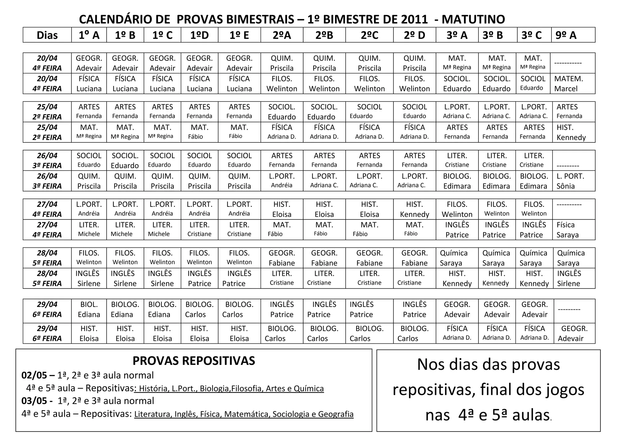 O documento apresenta o calendário de provas bimestrais do 1o bimestre de 2011 para os períodos matutino, vespertino e noturno, com as disciplinas e professores responsáveis por cada dia da semana. As provas repositivas serão nos dias 2 e 3 de maio, nas 4a e 5a aulas, para concluir os conteúdos do bimestre.