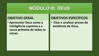 Este documento apresenta várias provas da existência de Deus, incluindo: 1) Não há efeito sem causa, e a causa de tudo na natureza que não é obra humana deve ser uma inteligência superior; 2) As obras da natureza revelam sabedoria e harmonia que ultrapassam a inteligência humana; 3) A crença instintiva em um poder superior encontrada em povos selvagens sem revelação.