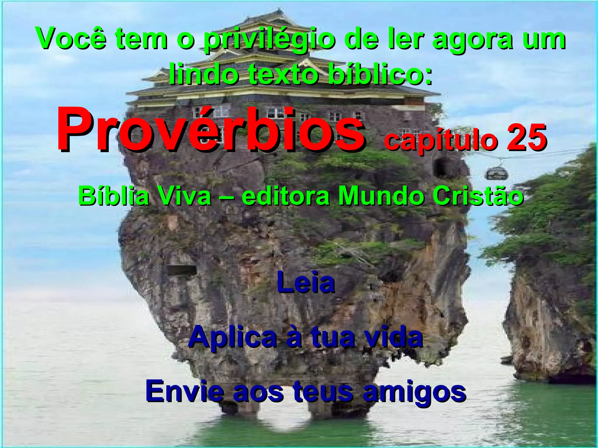 O documento apresenta vários provérbios bíblicos do livro de Provérbios, capítulo 25, que fornecem conselhos sobre humildade, justiça, paciência, amizade e perdão. Alguns dos provérbios destacam a importância de dar bons conselhos, ouvir críticas construtivas, tratar bem os inimigos e controlar as emoções. O texto também cita trechos do livro de Isaías sobre a sabedoria e poder de Deus.