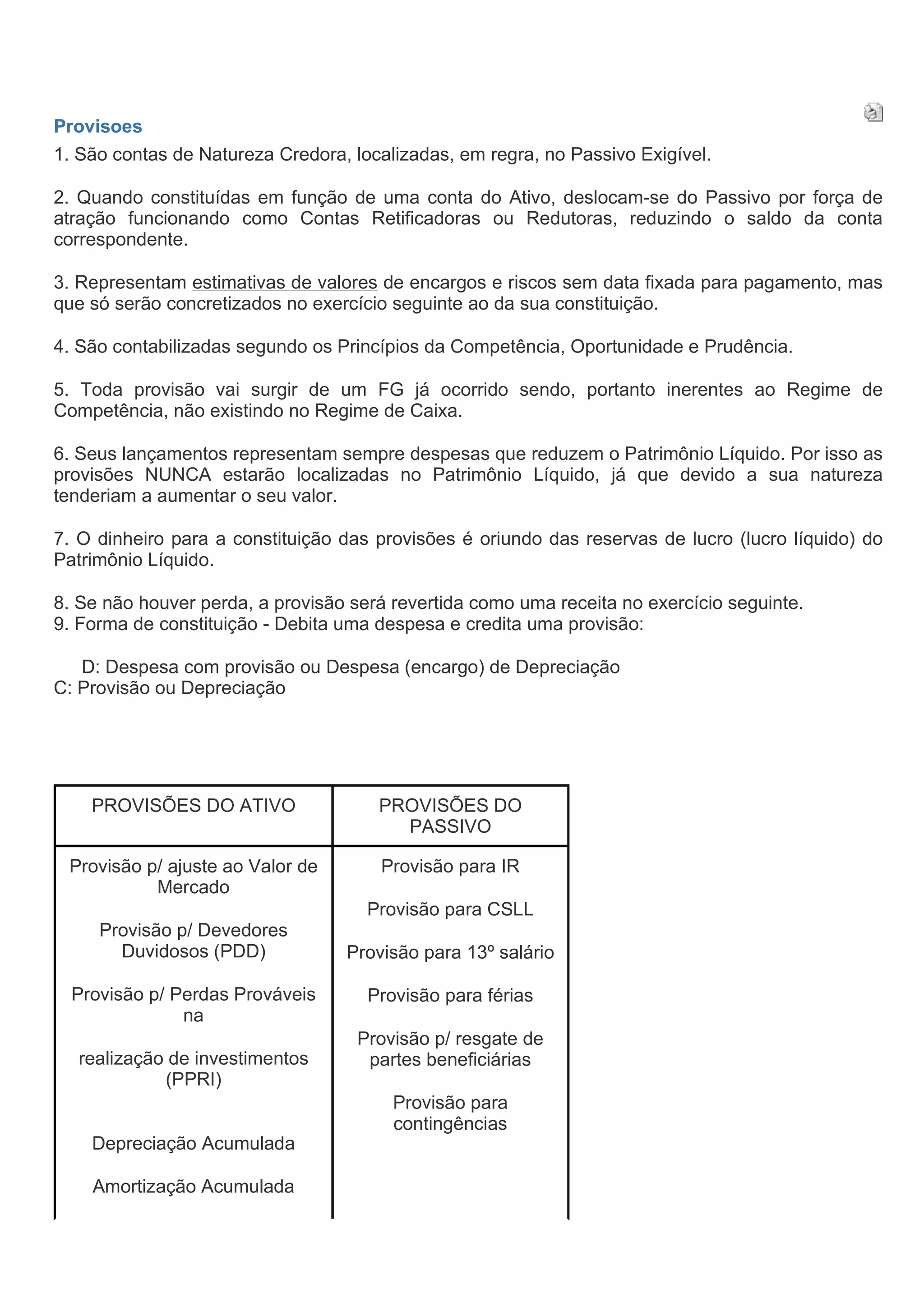 1. Provisões são contas credoras localizadas no passivo exigível que representam estimativas de encargos e riscos a pagar no futuro. 2. Elas podem funcionar como contas retificadoras quando constituídas em função de uma conta do ativo. 3. São contabilizadas de acordo com os princípios da competência, oportunidade e prudência, representando despesas que reduzem o patrimônio líquido.